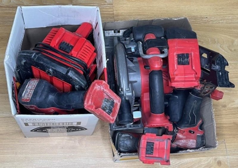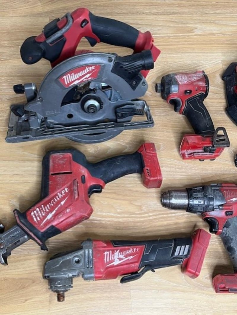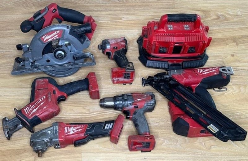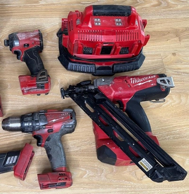 Cordless Milwaukee 18V tools. 1 x M18 CCS55 circular saw, 1 x M18 CN15GA nailer, 1 x M18 FHZ reciprocating saw, 1 x M18 FPD hammer drill, 1 x M18 FID3 impact driver, 1 x M1418C6 6 port charger, 1 x CAG125XPD angle grinder. Skins only, no batteries. Condition: Not working, untested, for parts or repair.