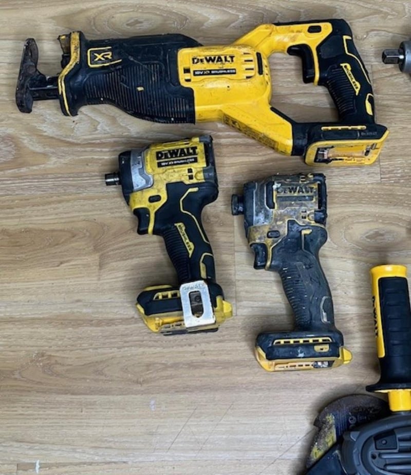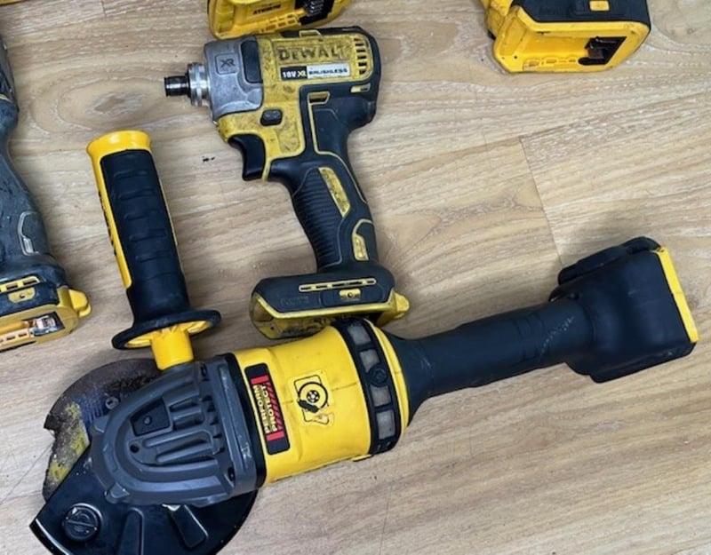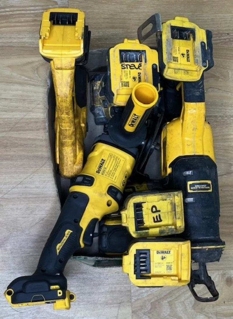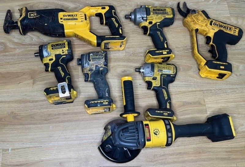 Cordless DeWalt tools. 1 x DCF850 impact driver (18V), 1 x DCF860 impact driver (18V), 1 x DCF887 XE impact driver (18V), 1 x DCMPP568 XE shears (18V), 1 x DCF892 impact wrench (18V), 1 x DCS382 reciprocating saw (18V), 1 x DCG418 angle grinder (54V). Skins only, no batteries. Condition: Not working, untested, for parts or repair.
