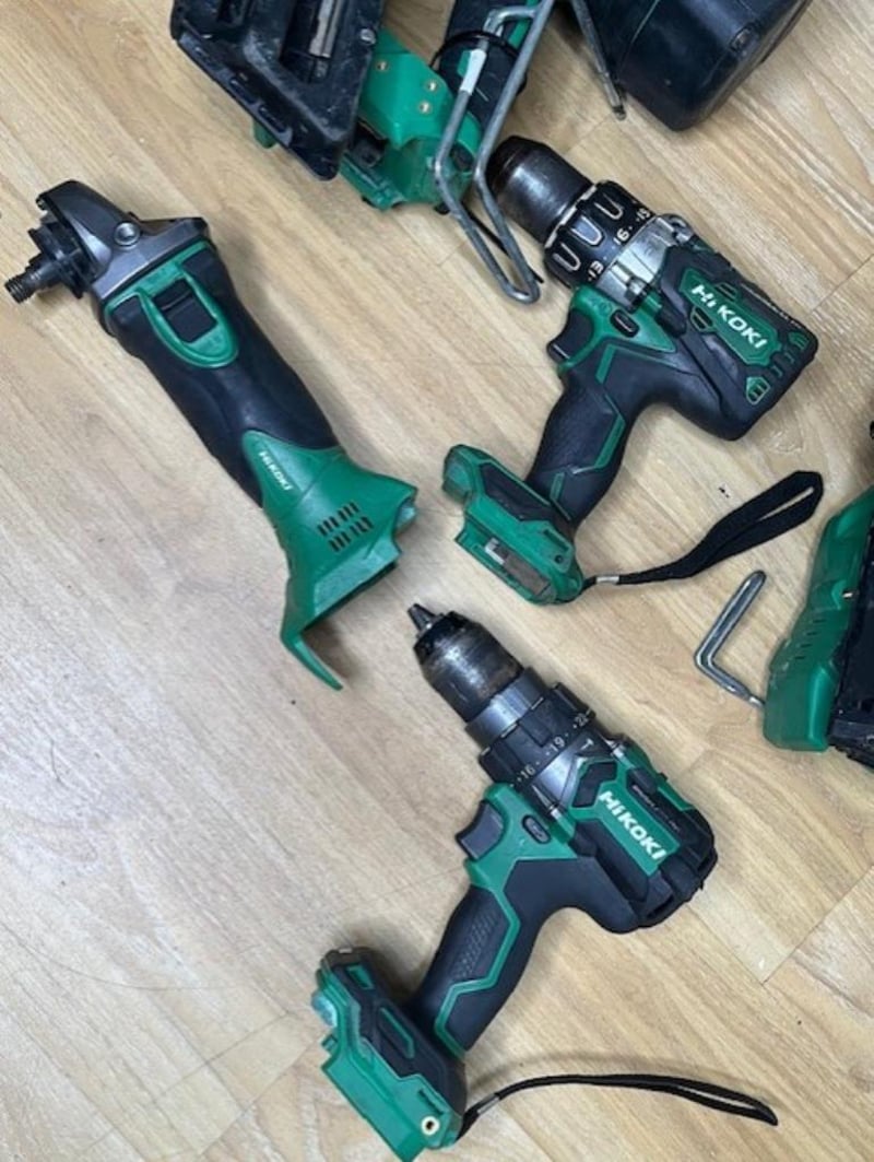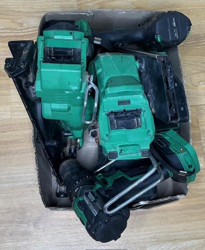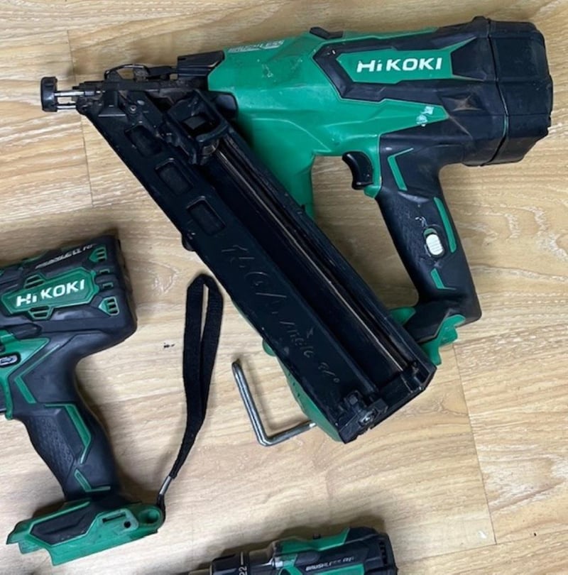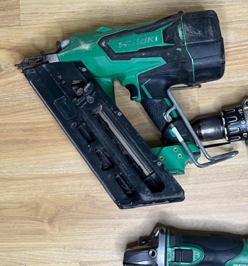 Cordless Hikoki 18V tools. 1 x DV 18DBL2 hammer drill, 1 x DV 18DC hammer drill, 1 x G 18DSL2 angle grinder, 1 x NT 1865DBAL finish nailer, 1 x NR 1890DBCL strip nailer. Skins only, no batteries. Condition: Not working, untested, for parts or repair.