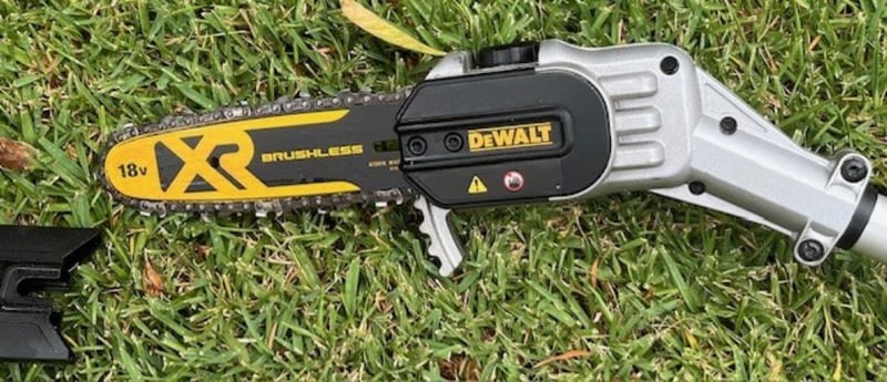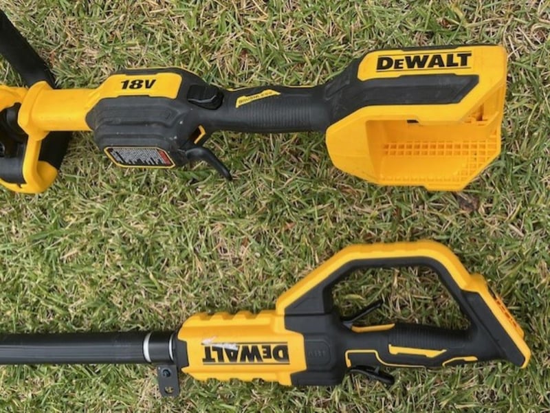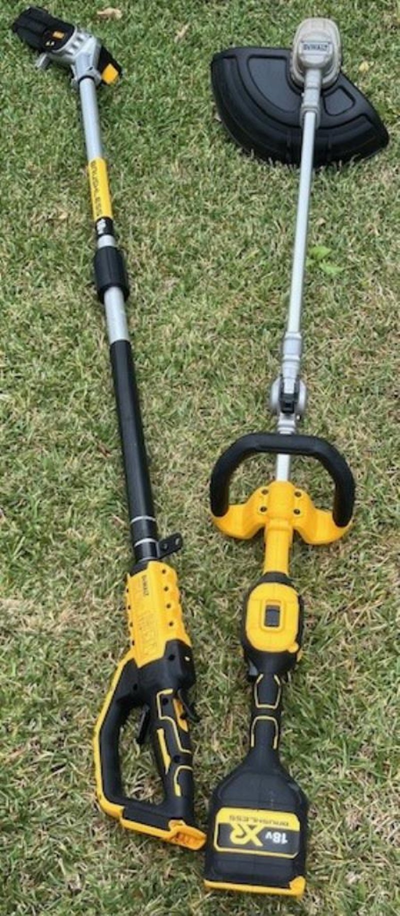 Cordless DeWalt 18V garden tools. 1 x DCMST561 XE line trimmer, 1 x DCMPS567 XE pole saw. Skins only, no batteries. Condition: Not working, untested, for parts or repair.