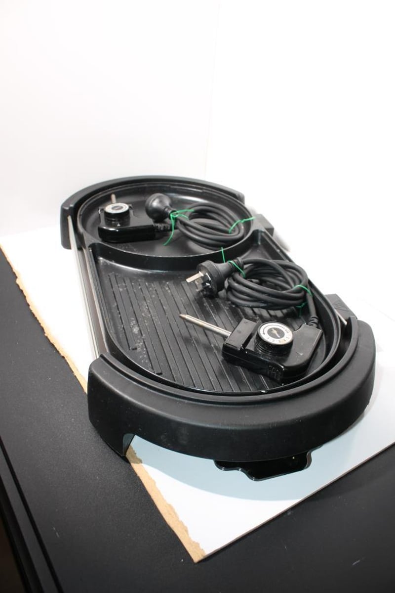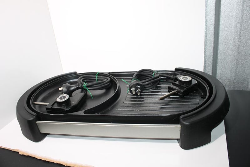 Electric Dual Grill / Buffet Hot Plate with Two Temperature ControlsTwin cooking surface electric grill or buffet hot plate with two removable thermostats.Includes two power cords and control units; brand and model not visible, condition as shown.