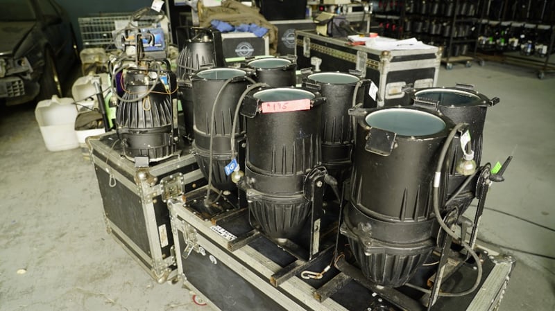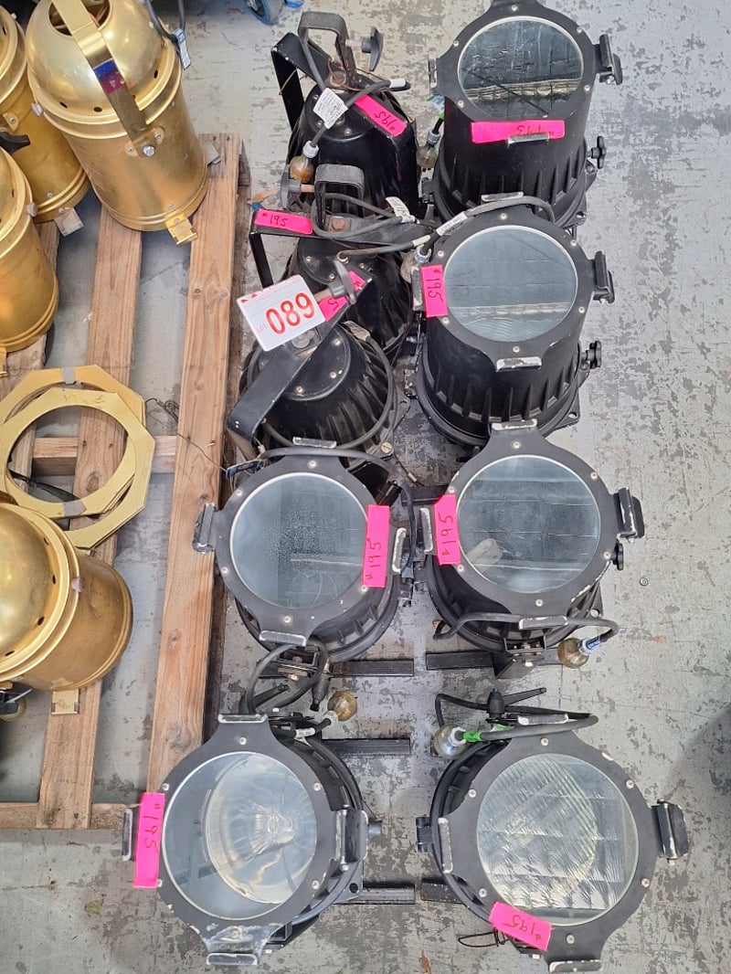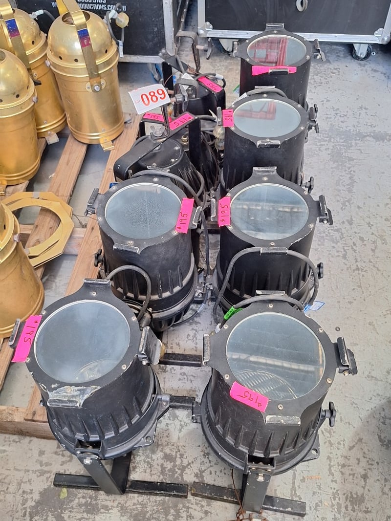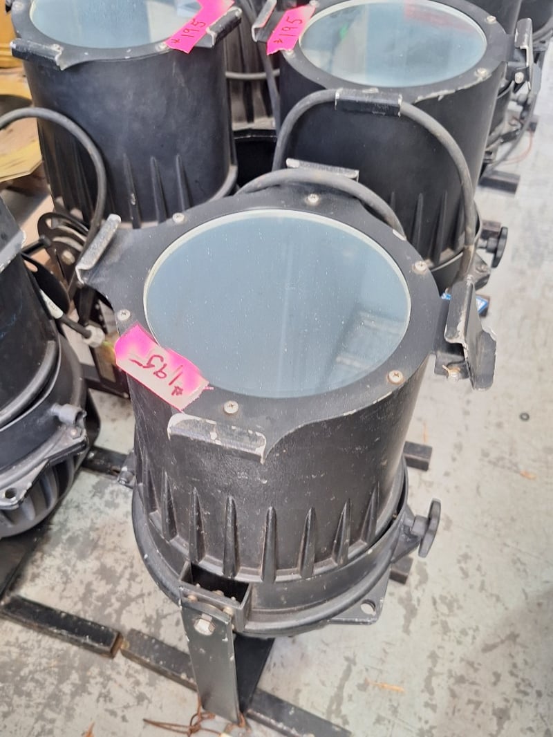 9 x Par 64 240V IP 64 Rated Pars 6 x on floor stand, 3x on Hooks, 2 x stubby versions, 2 x have no bulbs Sold As Lot