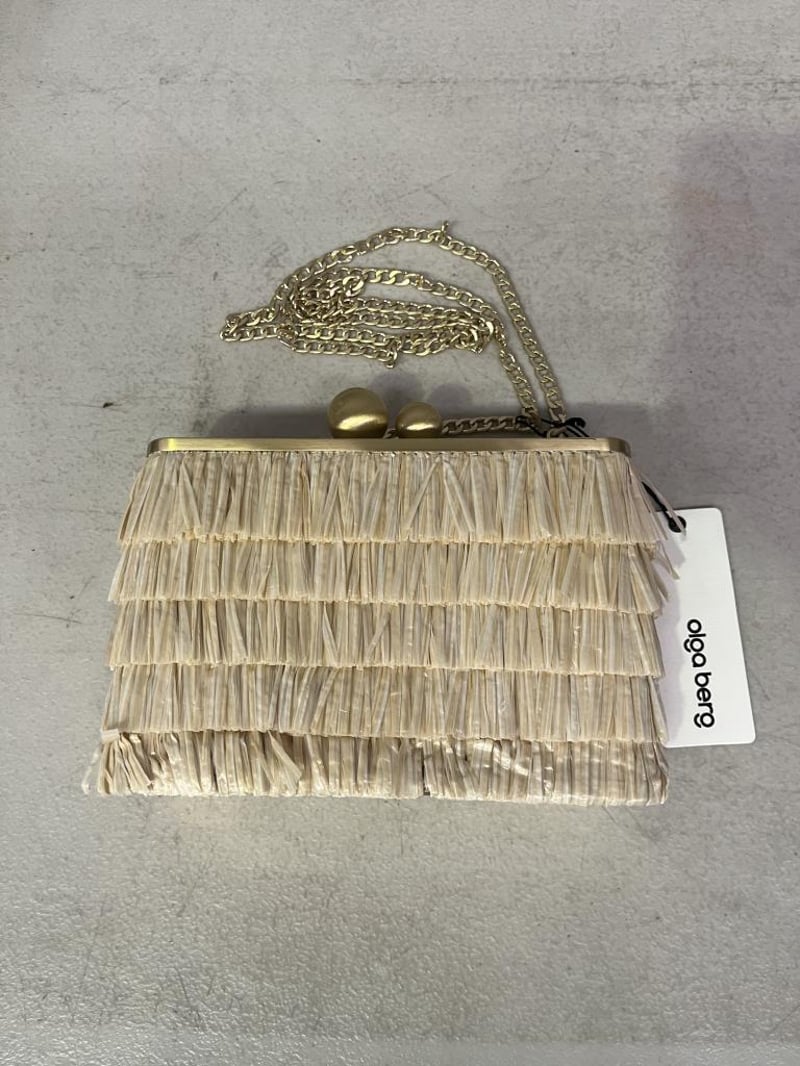 RRP $179 Olga Berg Carlita Fringe Clutch - Raffia Fringing and Brushed Gold Tone - DISPLAY STOCK MINOR USE