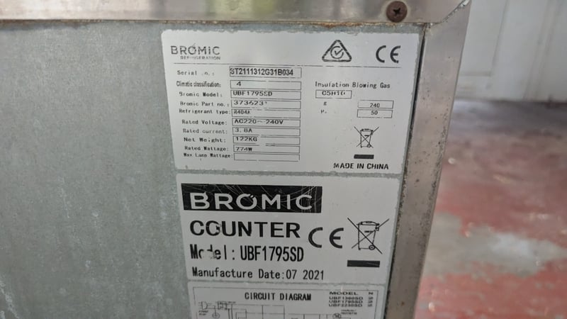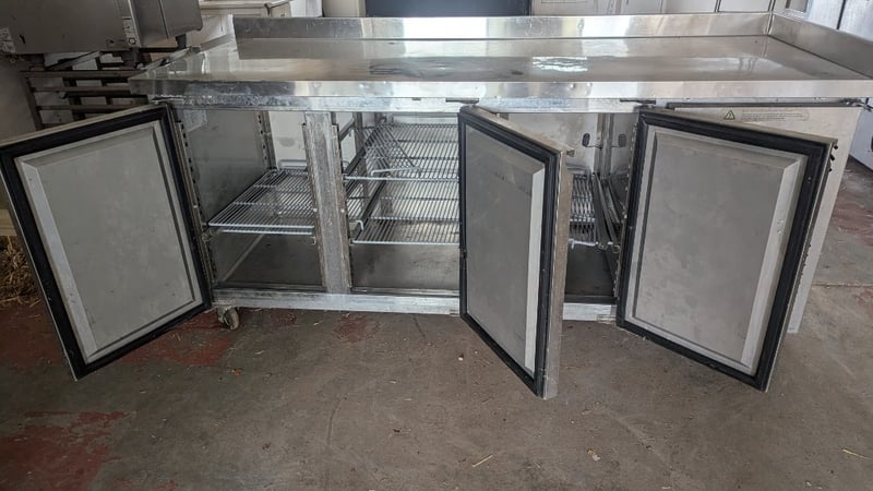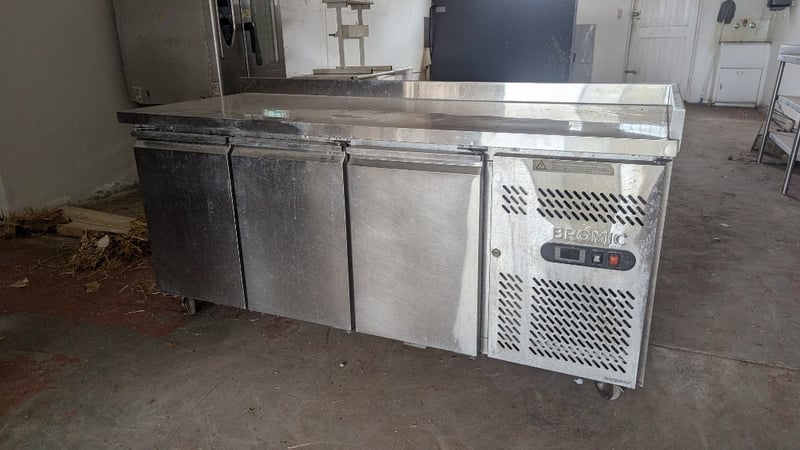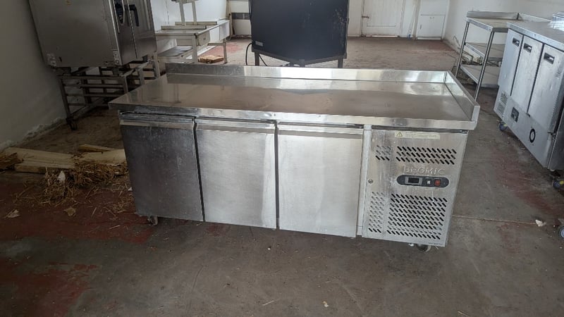 Refrigerated Counter, Bromic, Model: UBF1795SD, 240V, 3 Door, Bench Space, On Casters, Adjustable Shelving, Dimensions: 91cm(H)×180xm(W)×70cm(D)Note: Buyers Responsibility for Safe Removal, Labour and Transport of Goods