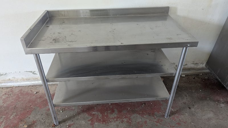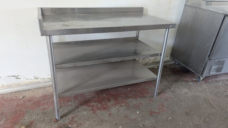 Stainless Steel Work Bench, 3 Shelves, Top With Guard, Dimensions: 95cm(H)×126cm(W)×65cm(D)