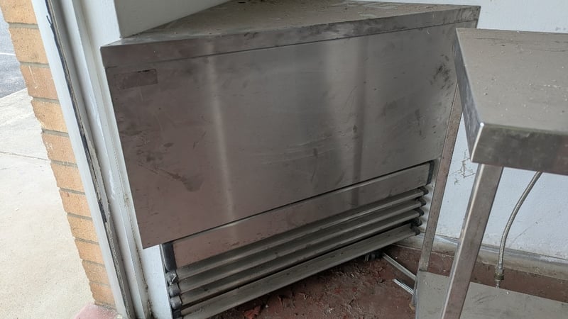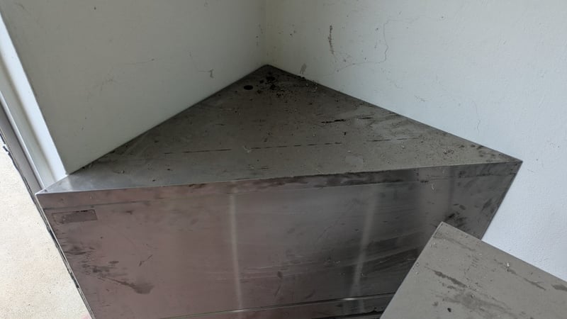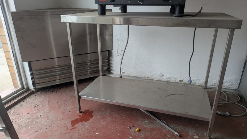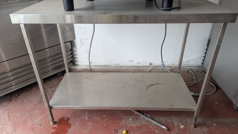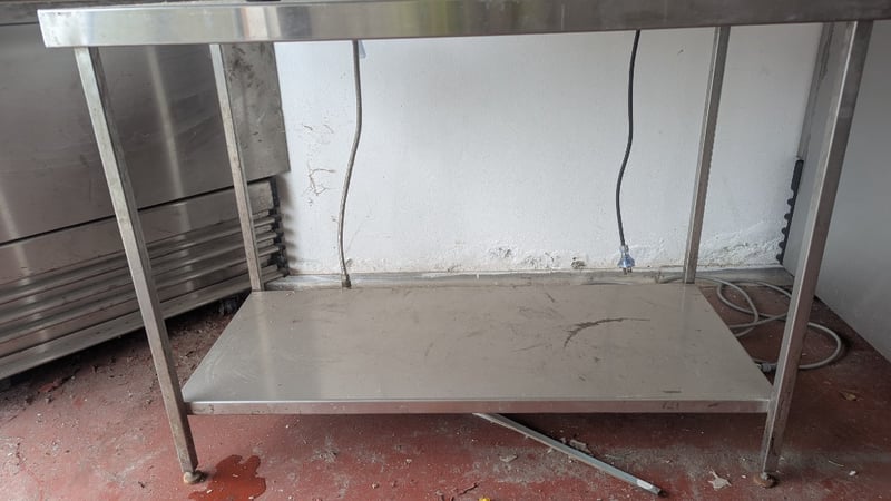 Stainless Steel Bench and Corner Unit, Dimensions: 90cm(H)×120cm(W)×60cm(D), 90cm(H)×103cm(W)×50cm(D), Quantity 2Sold As LotNote: Buyers Responsibility for Safe Removal, Labour and Transport of Goods