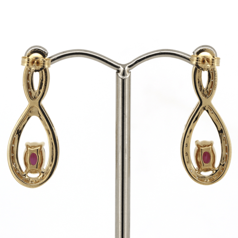 14K YELLOW GOLD, RUBY AND DIAMOND, INFINITY DROP EARRINGS.