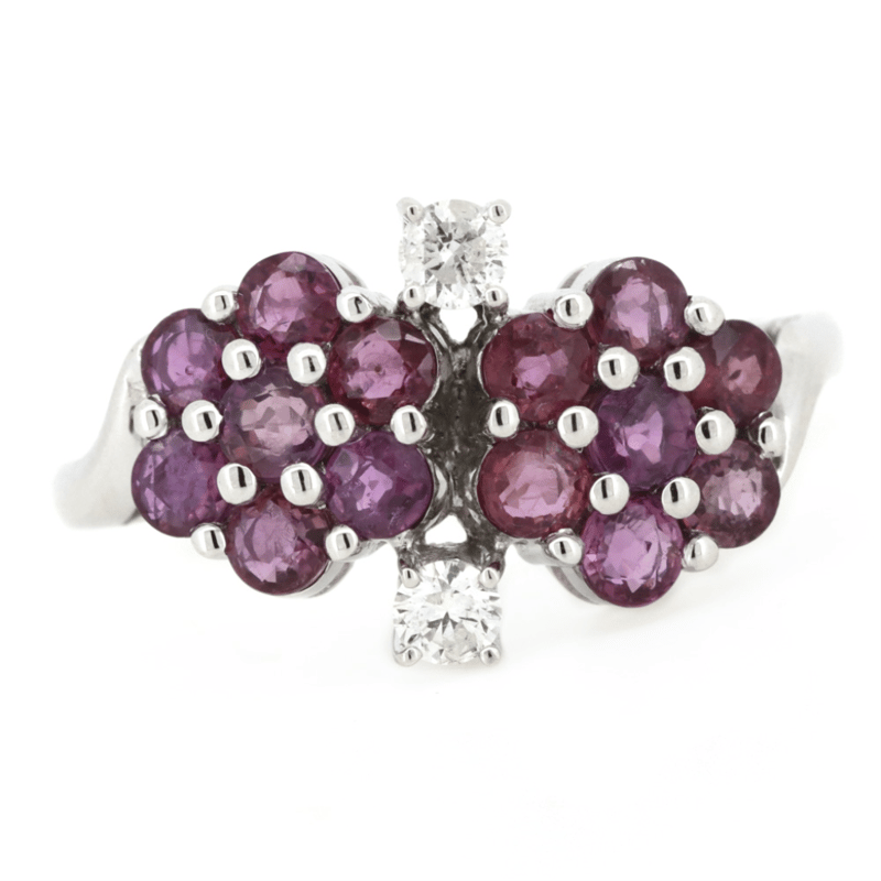 14K WHITE GOLD, RUBY AND DIAMOND, FLORAL RING. The Design Features, 14 Round Cut, Dark Purplish-Red, Rubies (2.04Ct Tsw, Light-Medium Inclusions), Claw Set. Encompassing The Design Are, 2 Round Brilliant Cut, Diamonds (0.14Ct Tdw, G-H Colour, Si-I1 Clarity), Shared Claw Set. Ring Size N 1/2. Valuations Provided by an Independent Third-Party Professional Not Directly Associated With Lloyds Auctions at AUD $$11,300.00This valuation has been conducted by an independent third-party professional. The valuation amount is an assessment by the issuing valuer and does not reflect the auction value of the item. Any inquiries regarding the valuation should be directed to the issuing valuer (refer to contact details on the certificate), as Lloyds Auctions has no affiliation or influence over the valuation, the valuer, or the stated amount. Condition: Good - Refer Images 0645941+1305