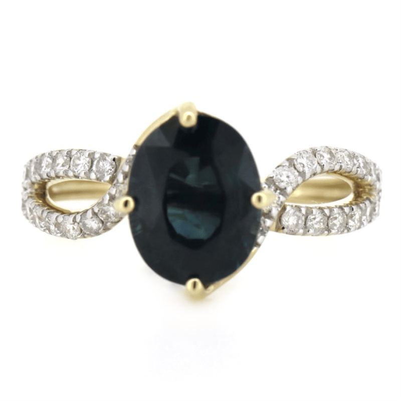 The Centre Features, One Oval Cut, Deep Bluish-Green, Sapphire (2.80Ct, Slightly Included), Claw Set. Decorating The Twist Band Are, 30 Round Brilliant Cut, Diamonds (0.37Ct Tdw, G-H Colour, Si1-Si2 Clarity), Micro-Claw Set In White Gold. Ring Size N.