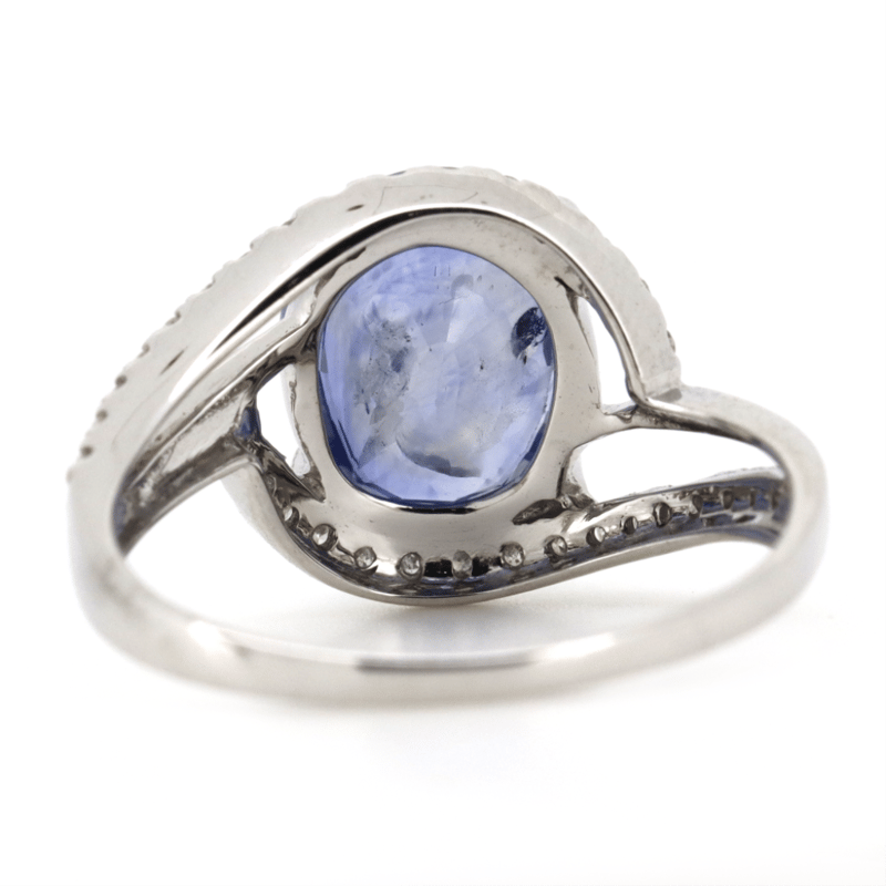 14K WHITE GOLD, BLUE SAPPHIRE AND DIAMOND, CROSS OVER RING.
