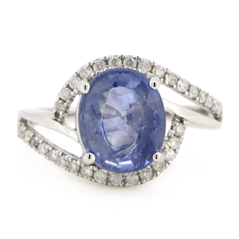 The Centre Features, One Oval Cut, Medium-Light Blue, Sapphire (3.48Ct, Minor Eye Visible Inclusions), 4 Claw Set. Decorating The Band Are, 32 Round Brilliant Cut, Diamonds (0.27Ct Tdw, J-K Colour, Si2-I2 Clarity), Micro-Claw Set. Ring Size N 1/2.