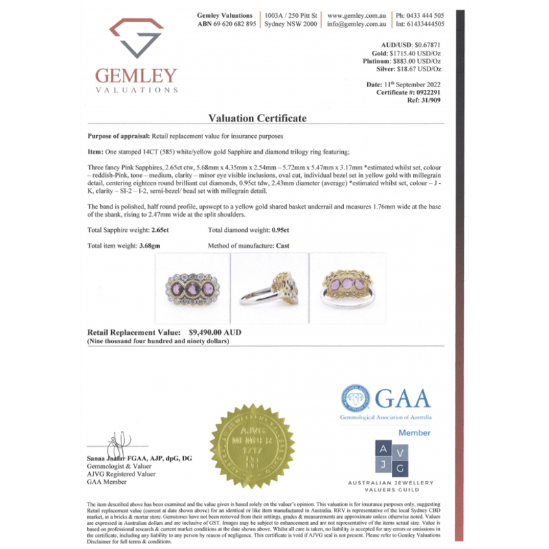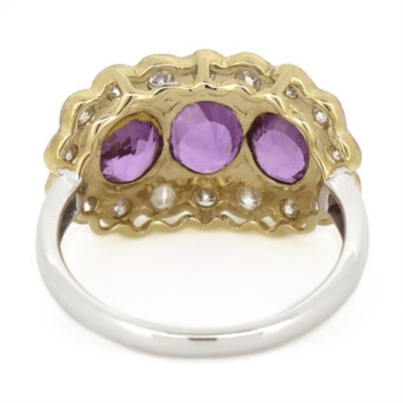The Design Features, 3 Oval Cut, Reddish-Pink, Sapphires (2.65Ct Tsw, Minor Eye Visible Inclusions), Bezel Set In Yellow Gold With Millegrain Detail. Encompassing The Design Are, 18 Round Brilliant Cut, Diamonds (0.95Ct Tdw, J-K Colour, Si2-I2 Clarity), Semi-Bezel/Bead Set With Millegrain Detail. Ring Size N.