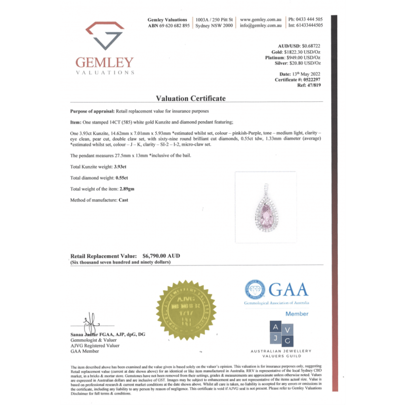 The Centre Features, One Pear Cut, Pinkish-Purple, Kunzite (3.93Ct, Eye Clean Clarity), Claw Set. Surrounding The Centre In A Double Halo And Decorating The Bail Are, 69 Round Brilliant Cut, Diamonds (0.55Ct Tdw, J-K Colour, Si2-I2 Clarity), Micro-Claw Set.