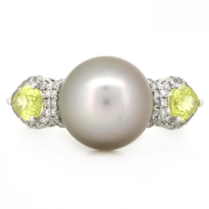 The Centre Features, One Near Round, Black With Pink Overtones, Cultured Tahitian Pearl (10.40Mm Size). Either Side Of The Centre Are, 2 Pear Cut, Yellow, Sapphires (0.76Ct Tsw), 3 Claw Set. Surrounding The Sapphires In Halos And Decorating The Setting Are, 54 Round Brilliant Cut, Diamonds (0.20Ct Tdw, J-K Colour, Si1-P1 Clarity), Claw Set. Ring Size M.