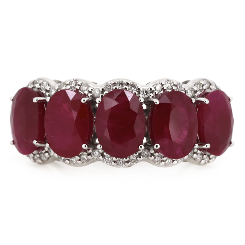 The Central Design Features, 5 Oval Faceted Cut, Medium Dark Pinkish-Red, Rubies (6.02Ct Tsw, Included, Enhanced), Claw Set. Bordering The Design Are, 50 Round Brilliant Cut, Diamonds (0.25Ct Tdw, J-K Colour, Si2-I2 Clarity), Claw Set. Ring Size M 1/2.