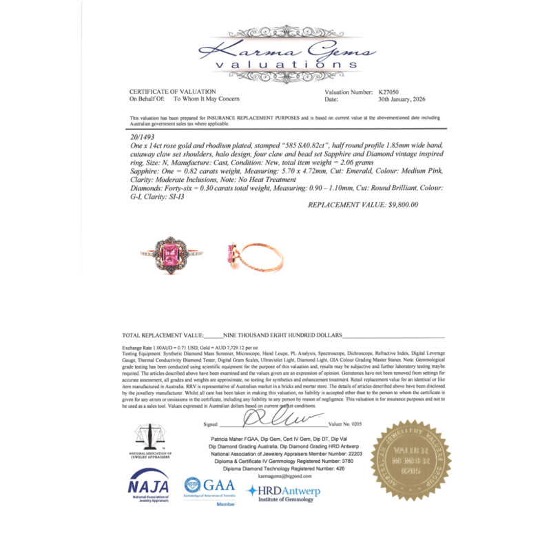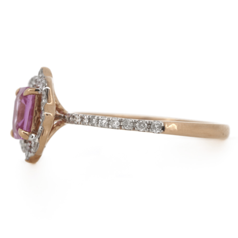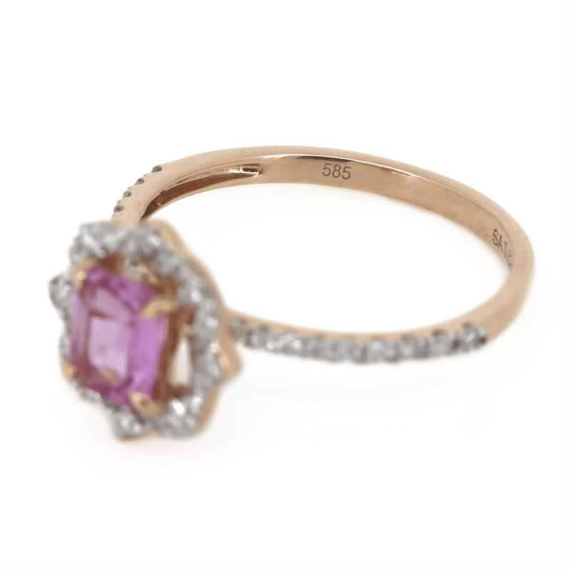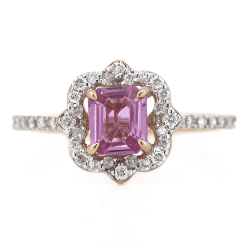 The Centre Features, One Emerald Cut, Medium Pink, Sapphire (0.82Ct, Moderate Inclusions, No Heat Treatment), 4 Claw Set. Surrounding The Centre In A Halo And Decorating The Band Are, 46 Round Brilliant Cut, Diamonds (0.30Ct Tdw, G-I Colour, Si-I3 Clarity), Bead/Claw Set. Ring Size N.