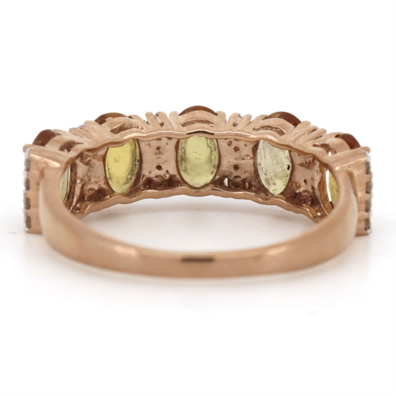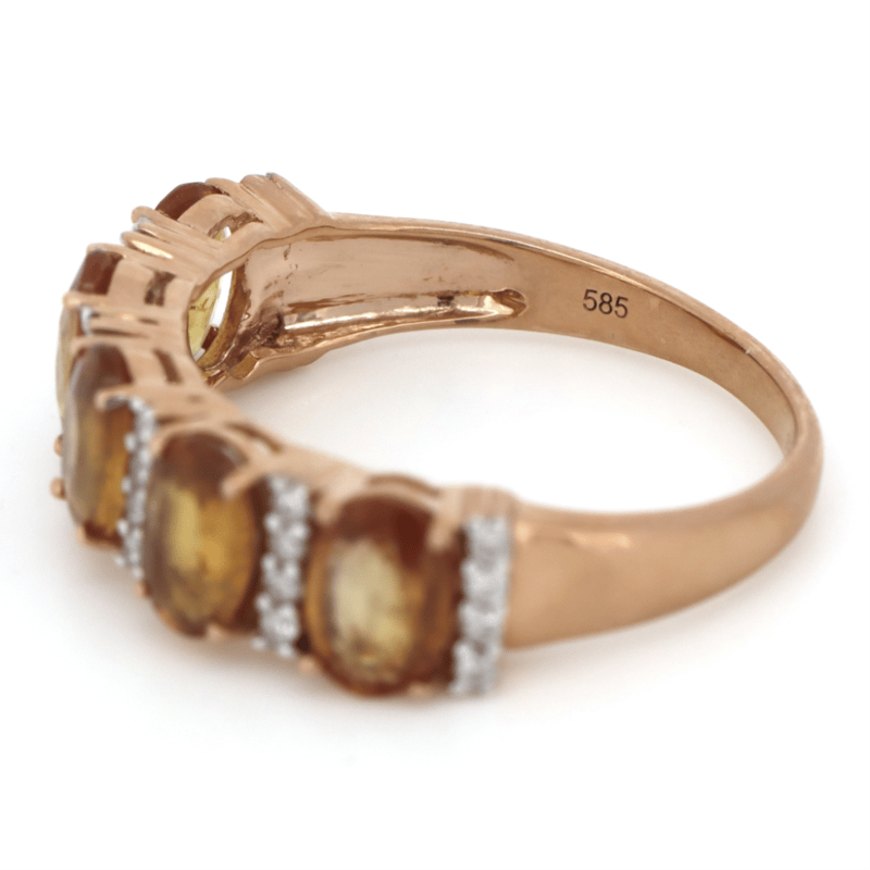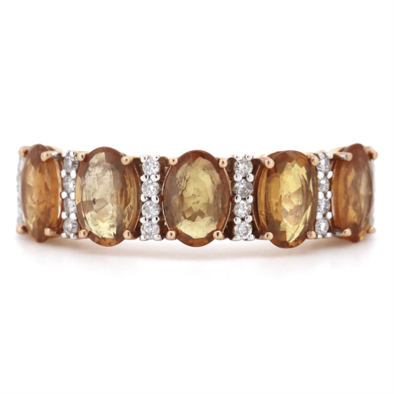 The Design Features, 5 Oval Cut, Reddish-Orange, Sapphires (2.35Ct Tsw, Minor Eye Visible Inclusions), Claw Set. Alternating Between The Sapphires In Rows Are, 24 Round Brilliant Cut, Diamonds (0.15Ct Tdw, J-K Colour, Si2-I2 Clarity), Micro Claw Set In White Gold. Ring Size N.