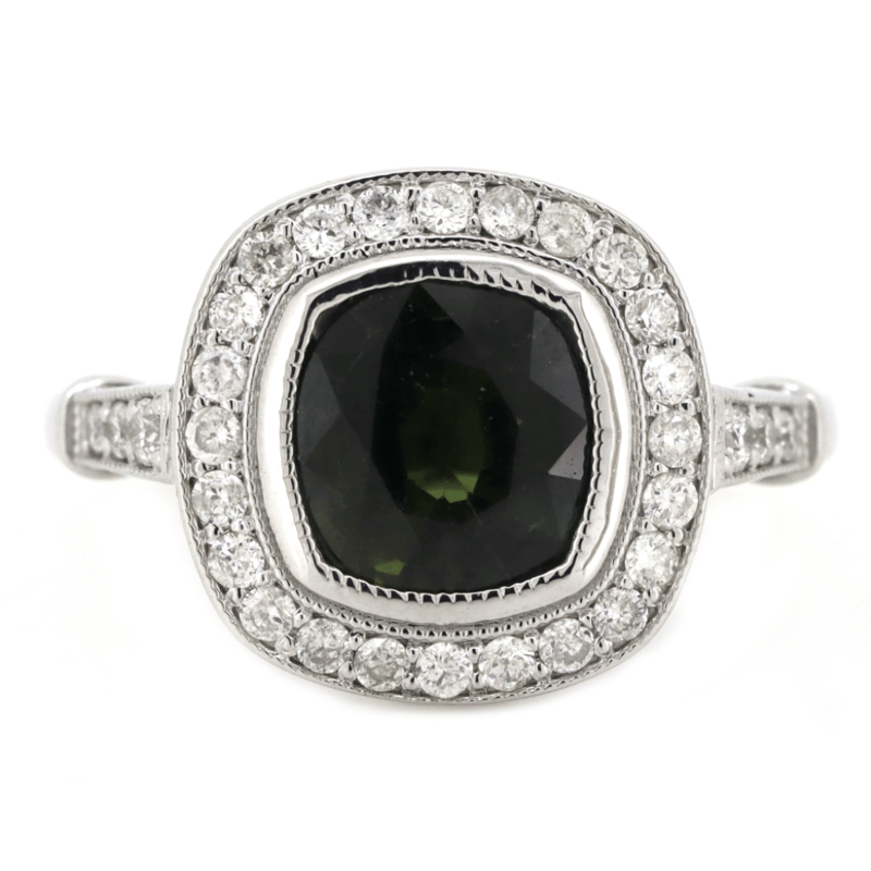 The Centre Features, One Cushion Faceted Cut, Deep Green, Sapphire (2.08Ct, Slightly Included), Bezel Set. Surrounding The Centre In A Halo And Decorating The Shoulders Are, 30 Round Brilliant Cut, Diamonds (0.39Ct Tdw, I-K Colour, P1-P2 Clarity), Bead Set. Ring Size N 1/2.