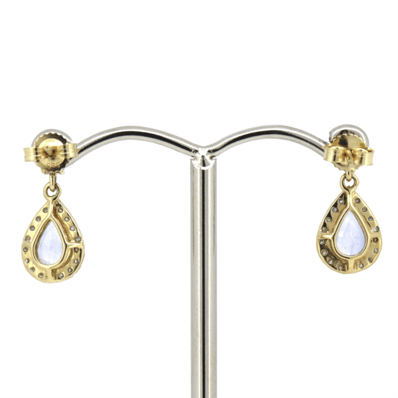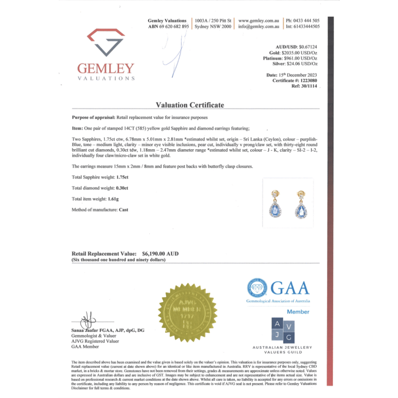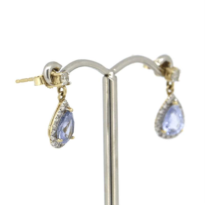 14K YELLOW GOLD, 1.75CT TSW CEYLON SAPPHIRE AND DIAMOND, DROP EARRINGS. The Central Designs Feature, 2 Pear Cut, Medium Light Purplish-Blue, Sapphires (1.75Ct Tsw, Minor Eye Visible Inclusions), Individually V Prong/Claw Set. Surrounding The Centres In Halos Are, 38 Round Brilliant Cut, Diamonds (0.30Ct Tdw, J-K Colour, Si2-I2 Clarity), Individually 4 Claw Set In White Gold. The Earrings Feature Post Backs With Butterfly Clasp Closures. Valuations Provided by an Independent Third-Party Professional Not Directly Associated With Lloyds Auctions at AUD $$6,190.00This valuation has been conducted by an independent third-party professional. The valuation amount is an assessment by the issuing valuer and does not reflect the auction value of the item. Any inquiries regarding the valuation should be directed to the issuing valuer (refer to contact details on the certificate), as Lloyds Auctions has no affiliation or influence over the valuation, the valuer, or the stated amount. Condition: Good - Refer Images 0645941+1336