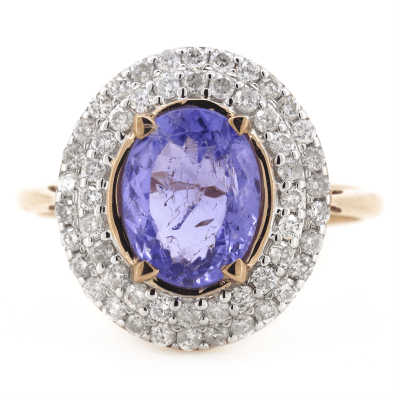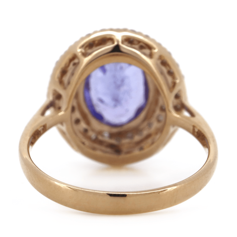 14K ROSE GOLD, TANZANITE AND DIAMOND, DOUBLE HALO RING.