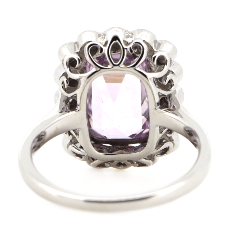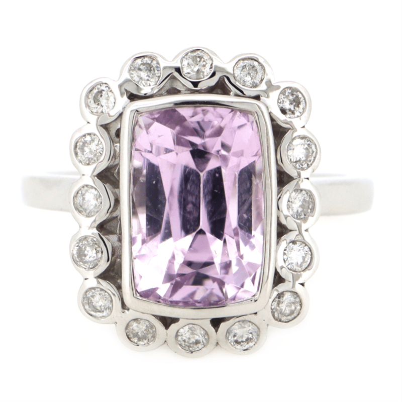 14K WHITE GOLD, KUNZITE AND DIAMOND, HALO RING.