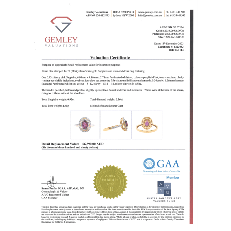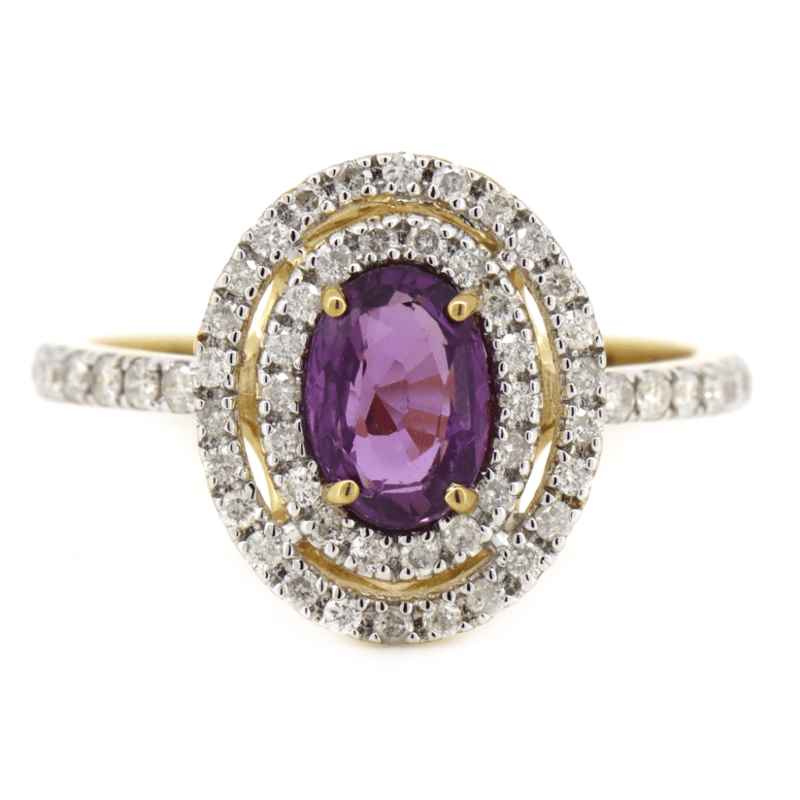 14K YELLOW GOLD, PINK SAPPHIRE AND DIAMOND, DOUBLE HALO RING. The Centre Features, One Oval Cut, Medium Purplish-Pink, Sapphire (0.92Ct, Minor Eye Visible Inclusions), 4 Claw Set. Surrounding The Centre In A Double Halo And Decorating The Band Are, 56 Round Brilliant Cut, Diamonds (0.36Ct Tdw, J-K Colour, Si2-I2 Clarity), Micro-Claw Set In White Gold. Ring Size M. Valuations Provided by an Independent Third-Party Professional Not Directly Associated With Lloyds Auctions at AUD $$6,390.00This valuation has been conducted by an independent third-party professional. The valuation amount is an assessment by the issuing valuer and does not reflect the auction value of the item. Any inquiries regarding the valuation should be directed to the issuing valuer (refer to contact details on the certificate), as Lloyds Auctions has no affiliation or influence over the valuation, the valuer, or the stated amount. Condition: Good - Refer Images 0645941+1340
