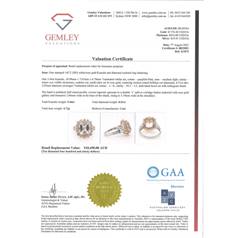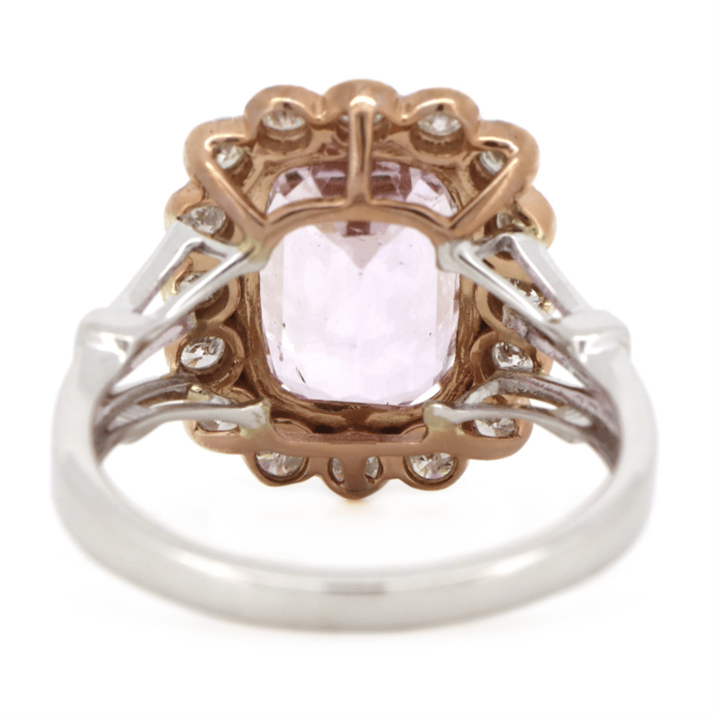 The Centre Features, One Cushion Cut, Medium Light Purplish-Pink, Kunzite (5.44Ct, Minor Eye Visible Inclusions), Multi-Claw Set In Rose Gold. Surrounding The Centre In Halo Are, 16 Round Brilliant Cut, Diamonds (0.51Ct Tdw, J-K Colour, Si2-I2 Clarity), Bezel Set With Millegrain Detail. Ring Size N.
