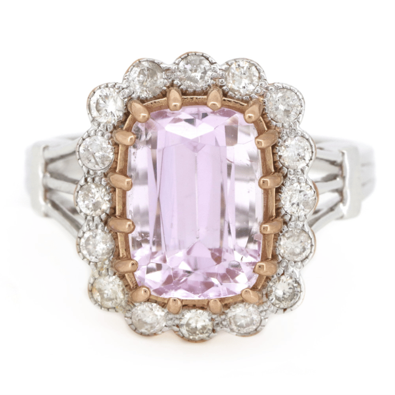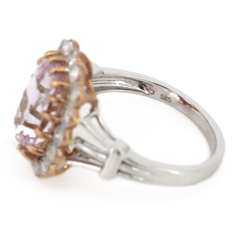 14K WHITE/ROSE GOLD, KUNZITE AND DIAMOND, VINTAGE INSPIRED RING.