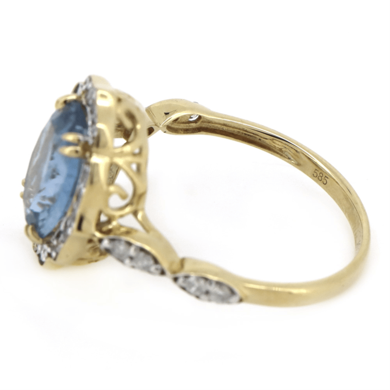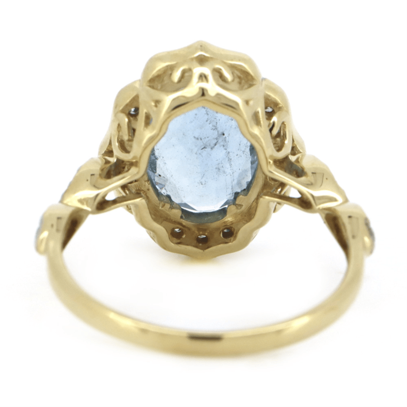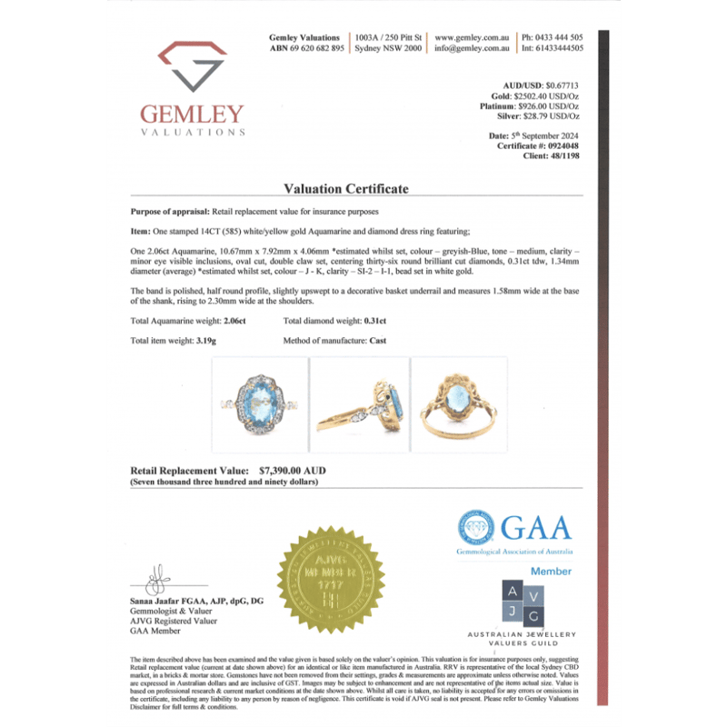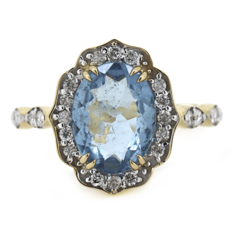 14K YELLOW/WHITE GOLD, AQUAMARINE AND DIAMOND, ANTIQUE INSPIRED RING. The Centre Features, One Oval Cut, Medium Greyish-Blue, Aquamarine (2.06Ct, Minor Eye Visible Inclusions), 4 Claw Set. Surrounding The Centre In A Halo And Decorating The Band Are, 36 Round Brilliant Cut, Diamonds (0.31Ct Tdw, J-K Colour, Si2-I1 Clarity), Bead Set In White Gold. Ring Size N. Valuations Provided by an Independent Third-Party Professional Not Directly Associated With Lloyds Auctions at AUD $$7,390.00This valuation has been conducted by an independent third-party professional. The valuation amount is an assessment by the issuing valuer and does not reflect the auction value of the item. Any inquiries regarding the valuation should be directed to the issuing valuer (refer to contact details on the certificate), as Lloyds Auctions has no affiliation or influence over the valuation, the valuer, or the stated amount. Condition: Good - Refer Images 0645941+1347