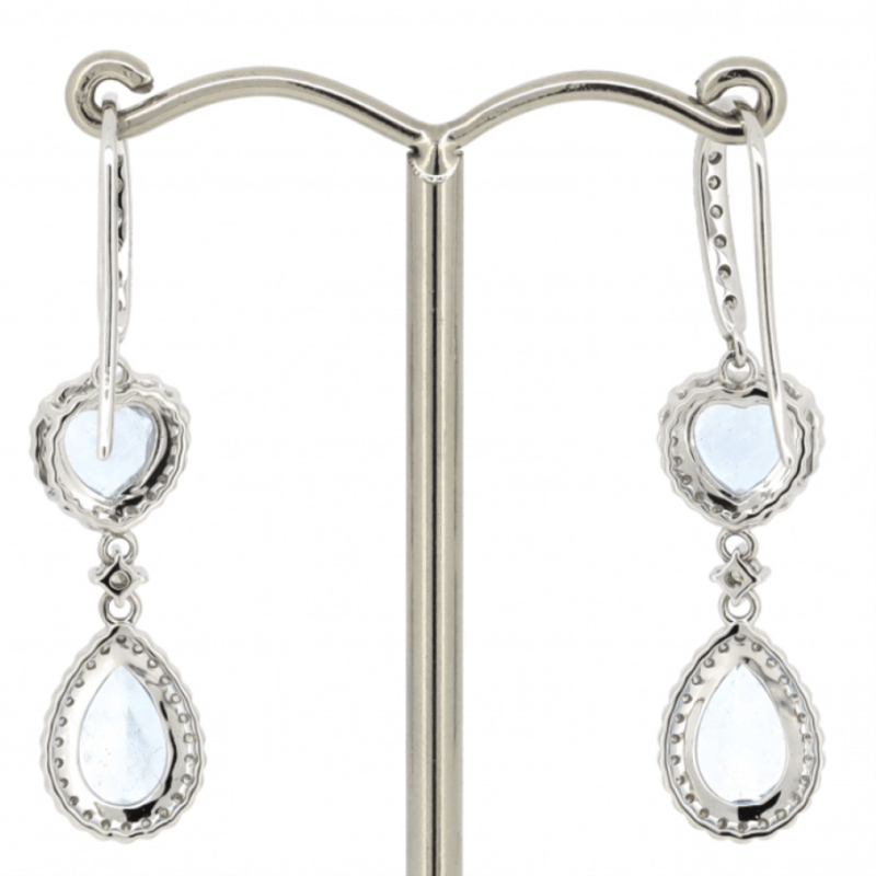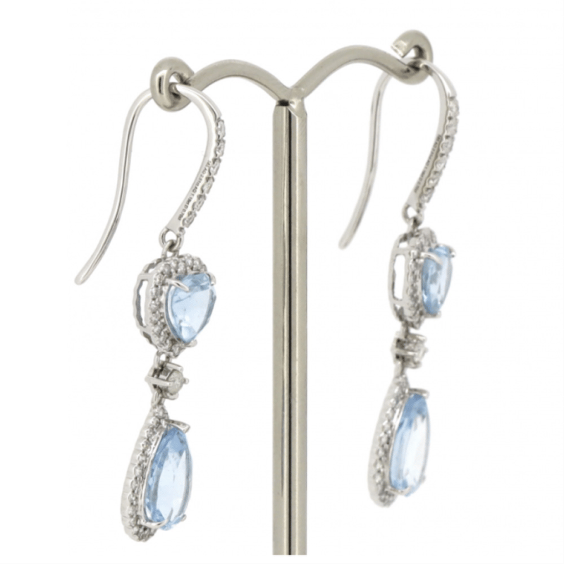 The Centres Feature, 2 Pear Faceted And 2 Heart Faceted Cut, Medium Blue, Aquamarines (3.70Ct Tsw, Slightly Included), 3-Claw Set. Surrounding The Centres In Halos And Decorating The Hooks Are, 102 Round Brilliant Cut, Diamonds (0.70Ct Tdw, I-K Colour, Si2-P2 Clarity), Claw Set. The Earrings Have Shepherd Hooks.