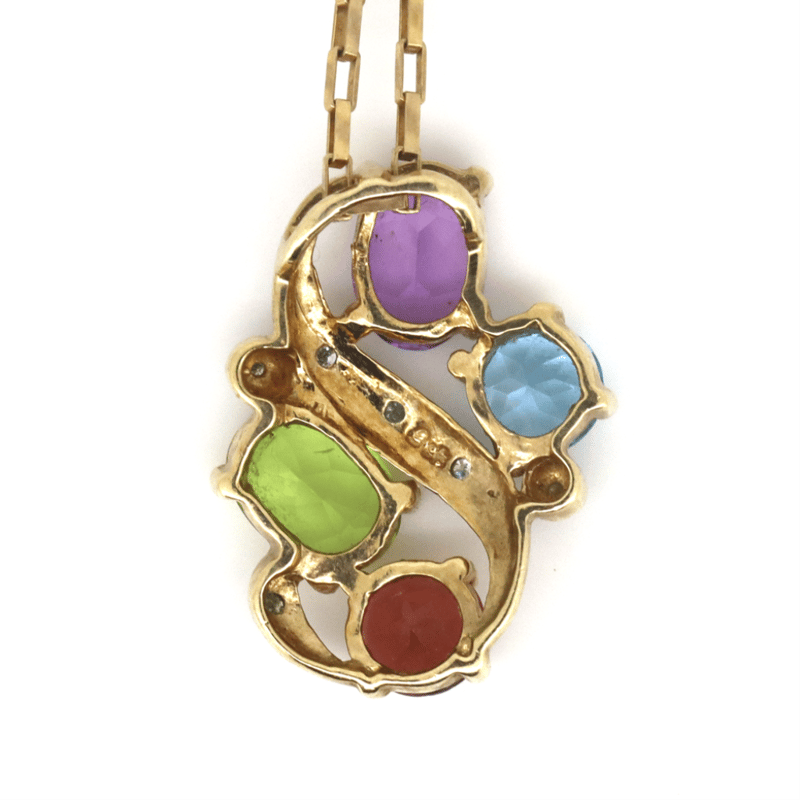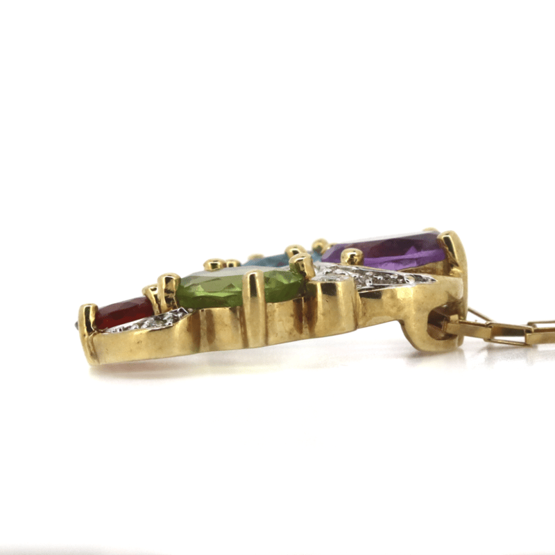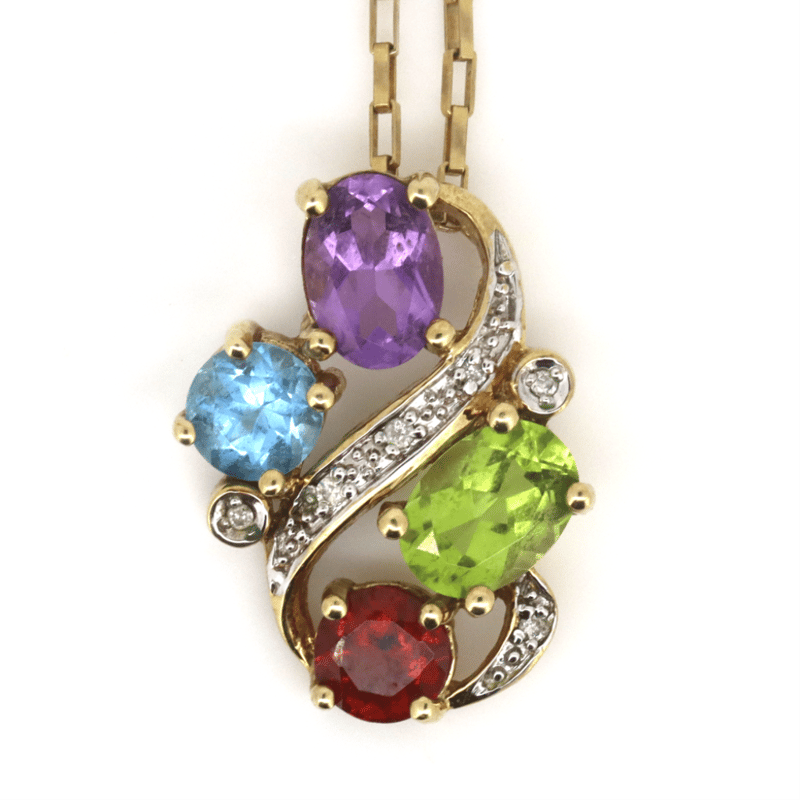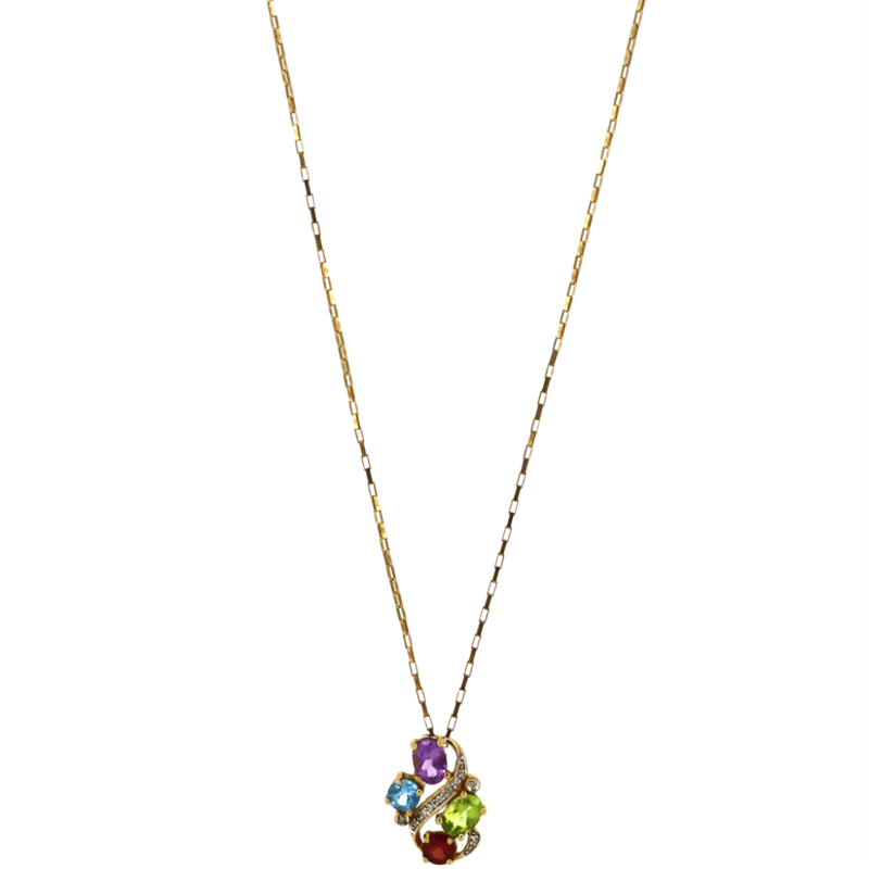 9K YELLOW GOLD/RHODIUM PLATED, AMETHYST, PERIDOT, TOPAZ, GARNET AND DIAMOND, NECKLACE.