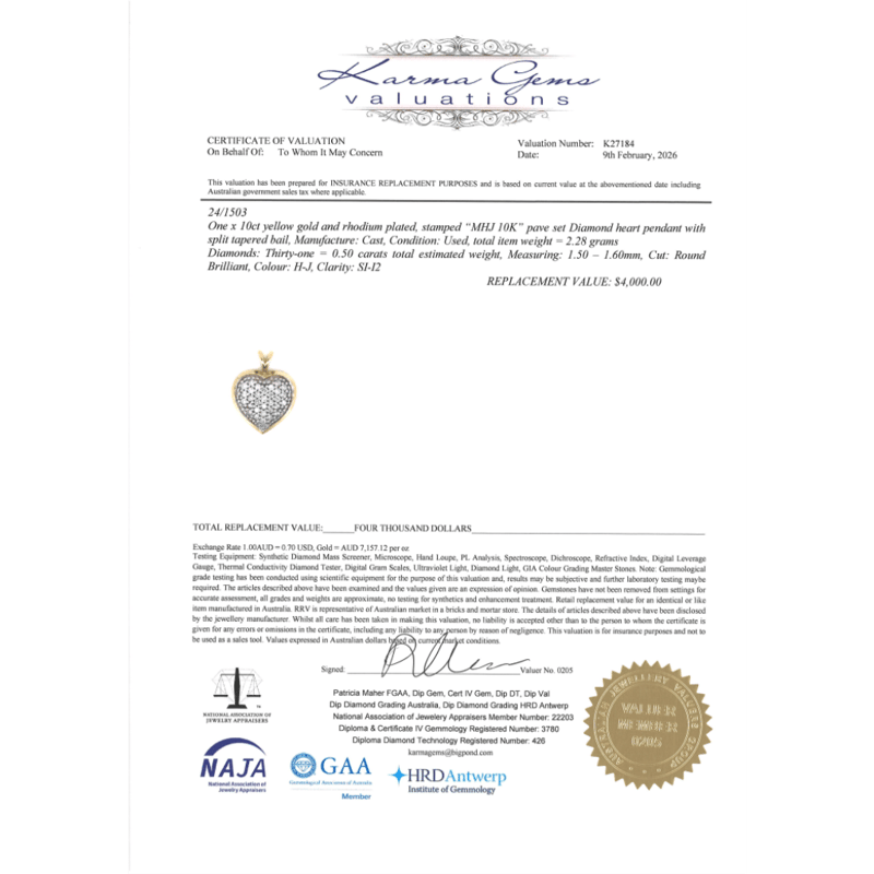 10K YELLOW GOLD AND DIAMOND, HEART PENDANT. The Pendant Features, 31 Round Brilliant Cut, Diamonds (0.50Ct Tdw, H-J Colour, Si-I2 Clarity), Pave Set. The Pendant Features A Split Tapered Bail. Condition: Pre-Owned. Total Weight: 2.28Grams. Valuations Provided by an Independent Third-Party Professional Not Directly Associated With Lloyds Auctions at AUD $$4,000.00This valuation has been conducted by an independent third-party professional. The valuation amount is an assessment by the issuing valuer and does not reflect the auction value of the item. Any inquiries regarding the valuation should be directed to the issuing valuer (refer to contact details on the certificate), as Lloyds Auctions has no affiliation or influence over the valuation, the valuer, or the stated amount. Condition: Good - Refer Images 0645941+1354