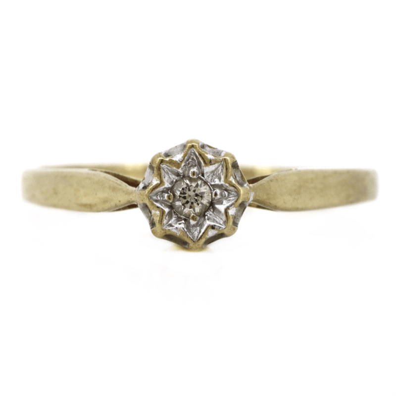 9K YELLOW GOLD AND DIAMOND, RING. The Ring Features One Diamond, Illusion Set.Condition: Pre-Owned. Total Weight: 1.34Grams. Condition: Good - Refer Images 0645941+1358