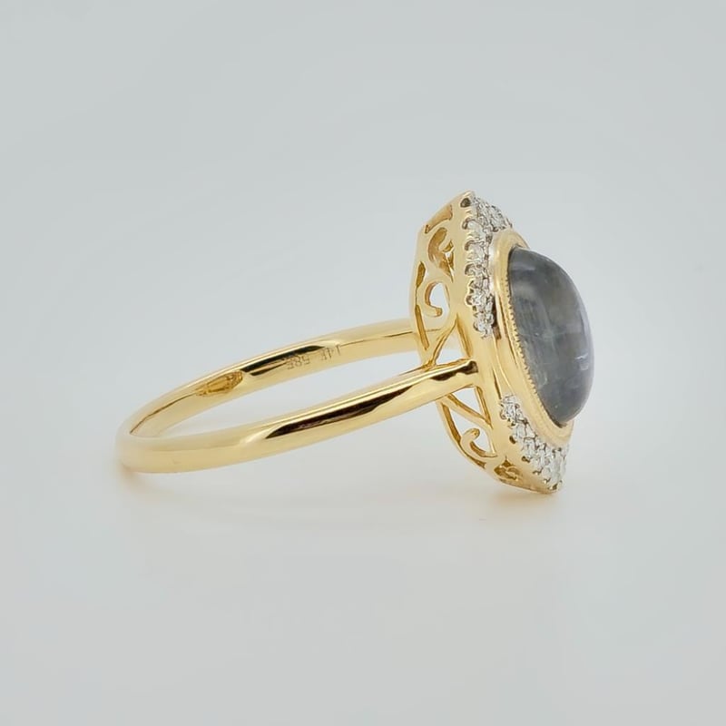 14CT YELLOW GOLD MOONSTONE AND DIAMOND HALO RING