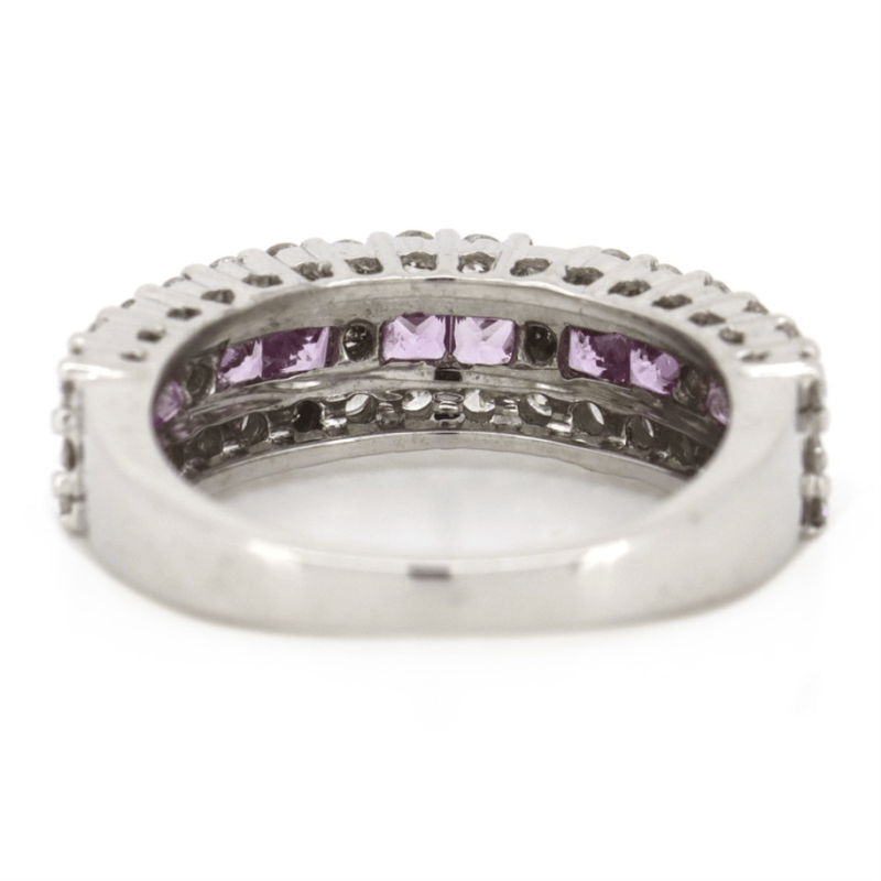 18K WHITE GOLD, PINK SAPPHIRE AND DIAMOND, BAND RING.