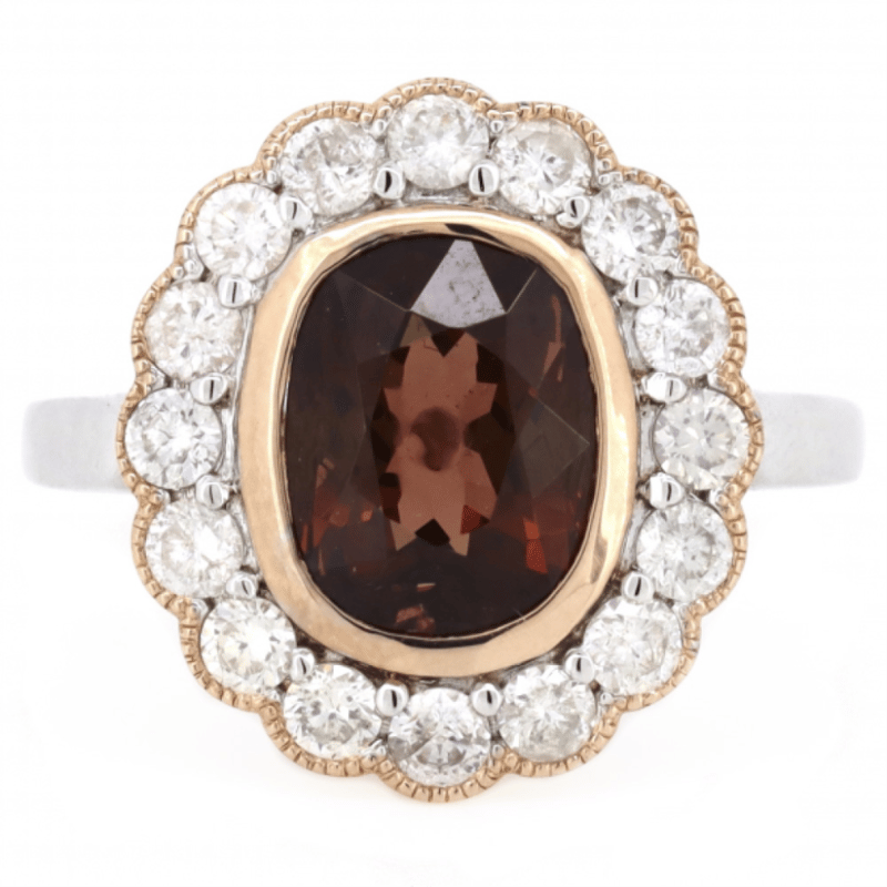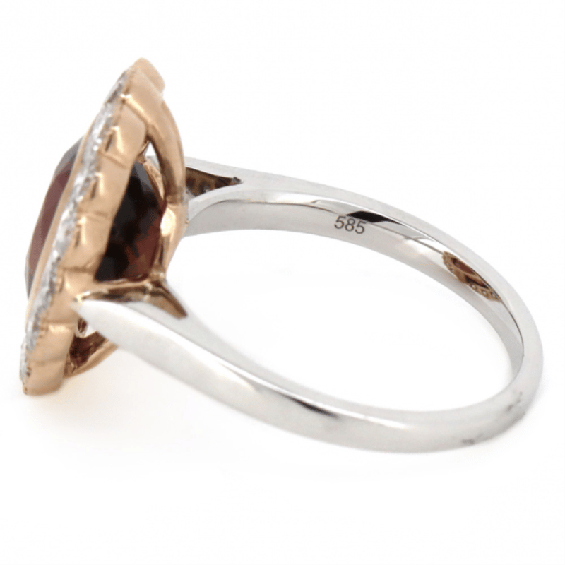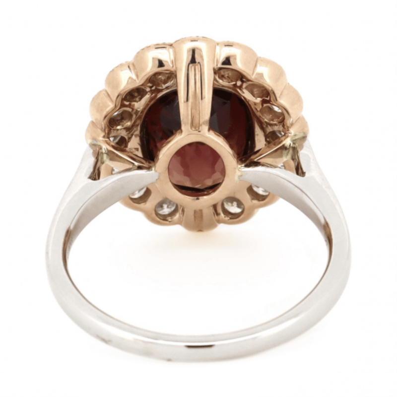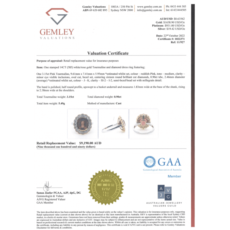 14K WHITE/ROSE GOLD, PINK TOURMALINE AND DIAMOND, HALO RING. The Centre Features, One Oval Cut, Medium Reddish-Pink, Tourmaline (3.15Ct, Minor Eye Visible Inclusions), Bezel Set. Surrounding The Centre In A Scalloped Halo Are, 16 Round Brilliant Cut, Diamonds (0.90Ct Tdw, J-K Colour, Si2-I2 Clarity), Semi-Bezel/Bead Set With Millegrain Detail. Ring Size N 1/2. Valuations Provided by an Independent Third-Party Professional Not Directly Associated With Lloyds Auctions at AUD $$9,190.00This valuation has been conducted by an independent third-party professional. The valuation amount is an assessment by the issuing valuer and does not reflect the auction value of the item. Any inquiries regarding the valuation should be directed to the issuing valuer (refer to contact details on the certificate), as Lloyds Auctions has no affiliation or influence over the valuation, the valuer, or the stated amount. Condition: Good - Refer Images 0645945+1404