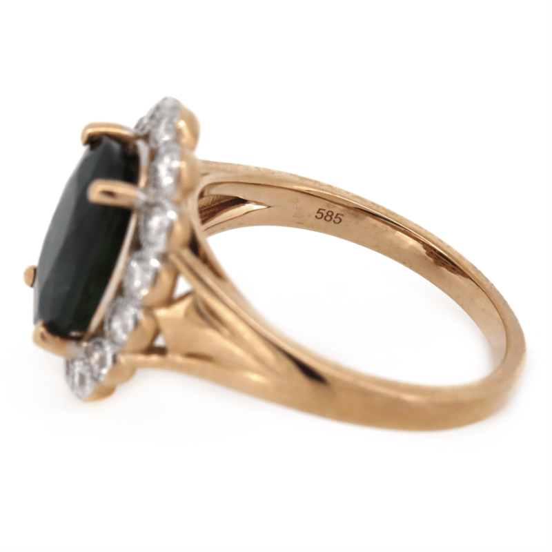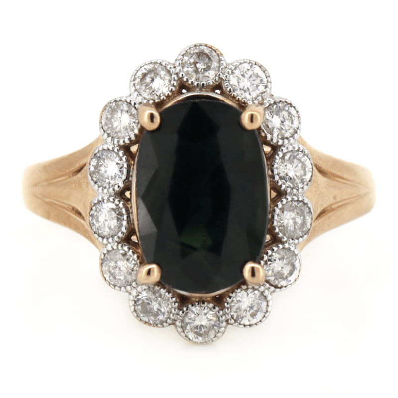 14K ROSE GOLD, GREEN SAPPHIRE AND DIAMOND, VINTAGE INSPIRED RING. The Centre Features, One Oval Cut, Medium Dark Bluish-Green, Sapphire (3.98Ct, Included), 4 Claw Set. Surrounding The Centre In A Halo Are, 14 Round Brilliant Cut, Diamonds (0.58Ct Tdw, J-K Colour, Si2-I2 Clarity), Bezel Set In White Gold With Millegrain Detail. Ring Size N 1/2. Valuations Provided by an Independent Third-Party Professional Not Directly Associated With Lloyds Auctions at AUD $$12,390.00This valuation has been conducted by an independent third-party professional. The valuation amount is an assessment by the issuing valuer and does not reflect the auction value of the item. Any inquiries regarding the valuation should be directed to the issuing valuer (refer to contact details on the certificate), as Lloyds Auctions has no affiliation or influence over the valuation, the valuer, or the stated amount. Condition: Good - Refer Images 0645945+1408