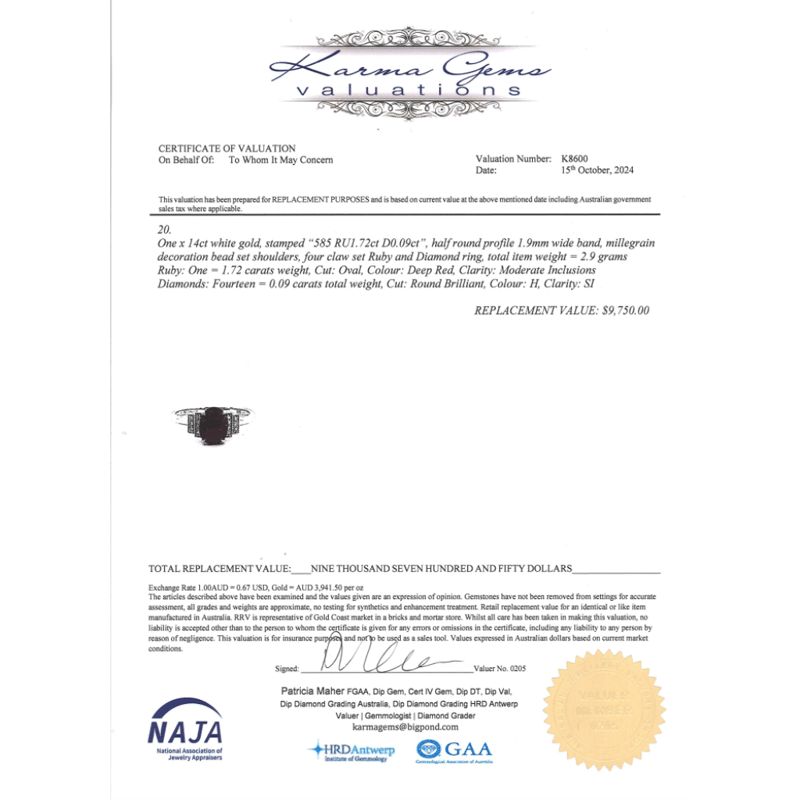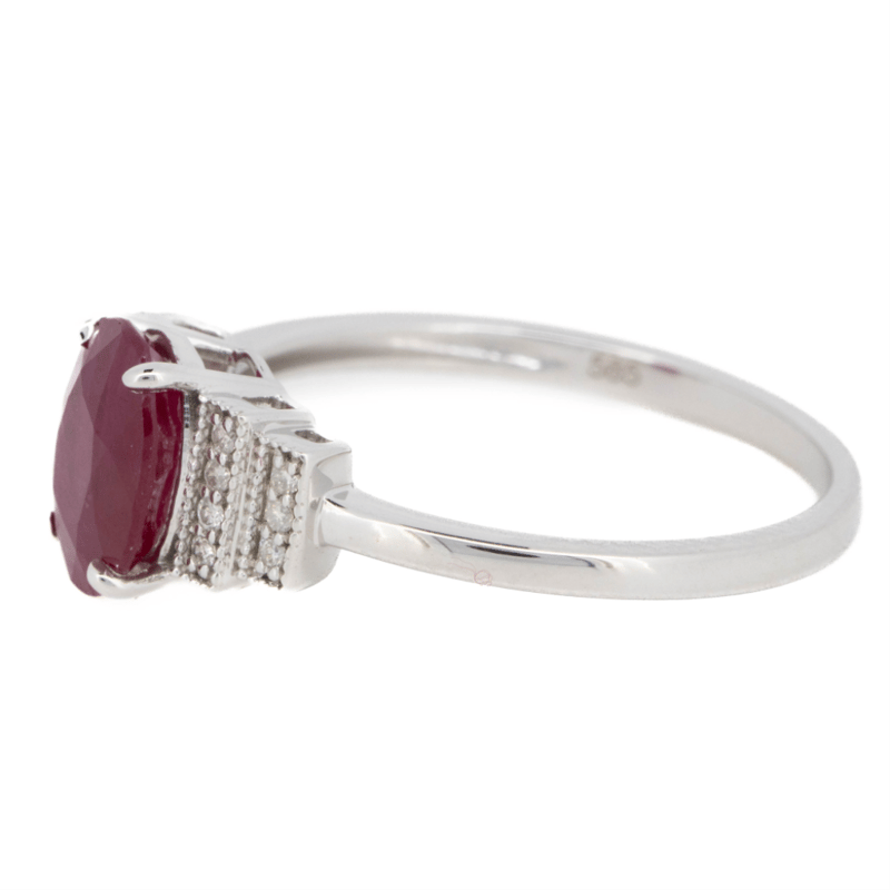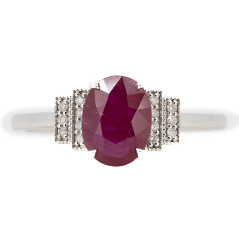 The Centre Features, One Oval Cut, Deep Red, Ruby (1.72Ct, Moderately Included), Claw Set. Flanking The Centre Are, 14 Round Brilliant Cut, Diamonds (0.09Ct Tdw, H Colour, Si Clarity), Bead Set With Millegrain Detail. Ring Size Q.