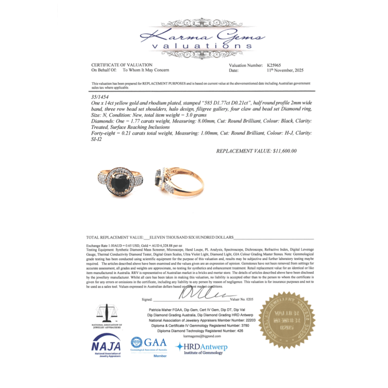 The Centre Features, One Round Brilliant Cut, Black, Diamond (1.77Ct, Treated, Surface Reaching Inclusions), 4 Claw Set. Surrounding The Centre And Decorating The Band Are, 48 Round Brilliant Cut, Diamonds (0.21Ct Tdw, H-J Colour, Si-I2 Clarity), Bead Set. Ring Size N.