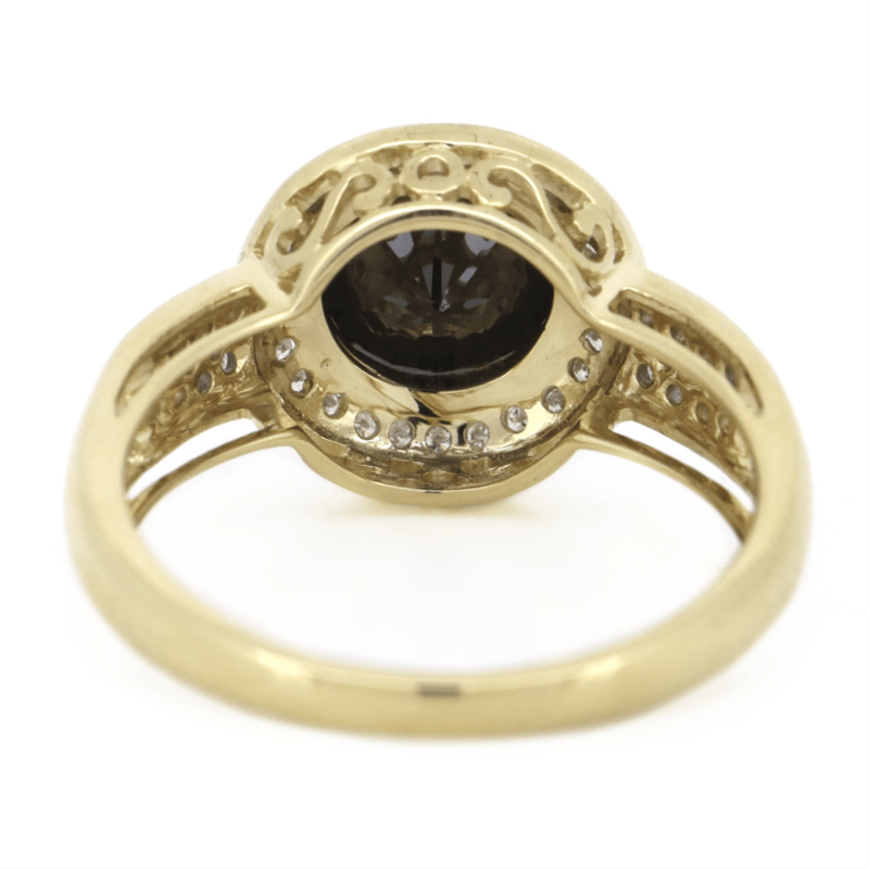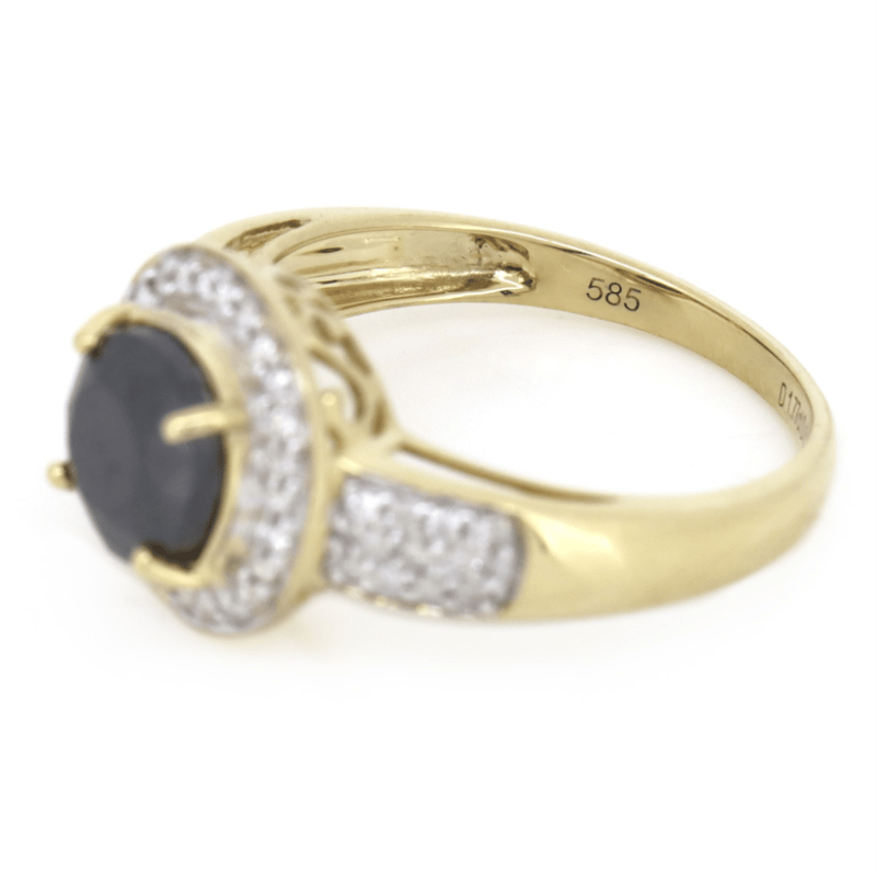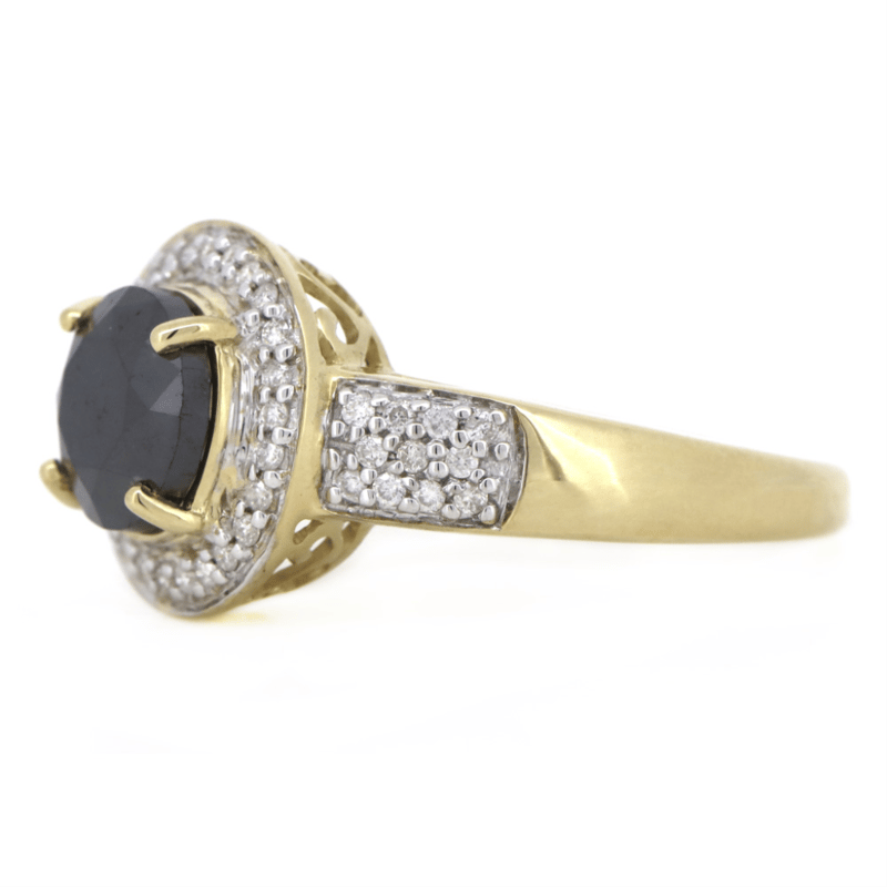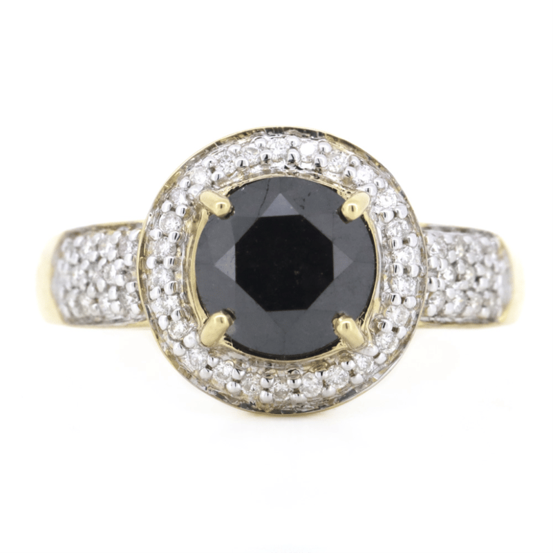 14K YELLOW GOLD, BLACK DIAMOND AND DIAMOND, HALO RING.