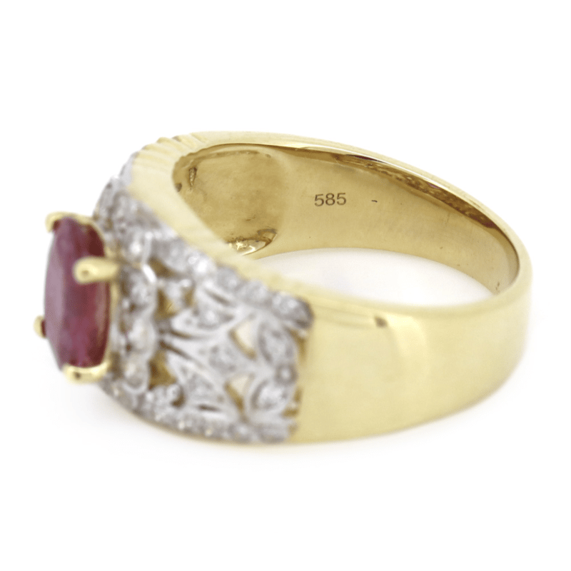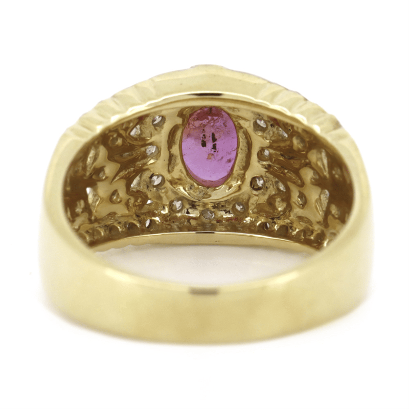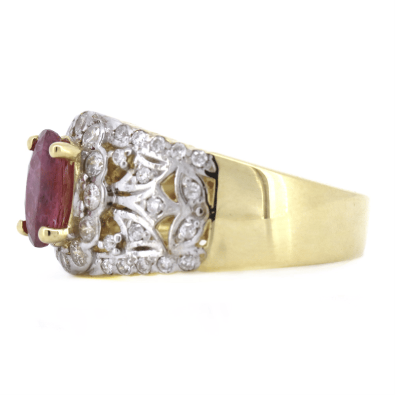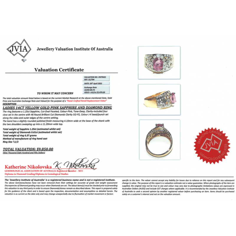 14K YELLOW GOLD, PINK SAPPHIRE AND DIAMOND, DECORATIVE RING. The Centre Features, One Oval Faceted Cut, Deep Pink, Sapphire (1.25Ct Tsw, Included), 4 Claw Set. Surrounding The Centre In A Halo And Decorative Band Design Are, 46 Round Brilliant Cut, Diamonds (0.61Ct Tdw, J-K Colour, Si2-P2 Clarity), Bead/Punch Set. Ring Size L 1/2. C Valuations Provided by an Independent Third-Party Professional Not Directly Associated With Lloyds Auctions at AUD $$9,850.00This valuation has been conducted by an independent third-party professional. The valuation amount is an assessment by the issuing valuer and does not reflect the auction value of the item. Any inquiries regarding the valuation should be directed to the issuing valuer (refer to contact details on the certificate), as Lloyds Auctions has no affiliation or influence over the valuation, the valuer, or the stated amount. Condition: Good - Refer Images 0645945+1437