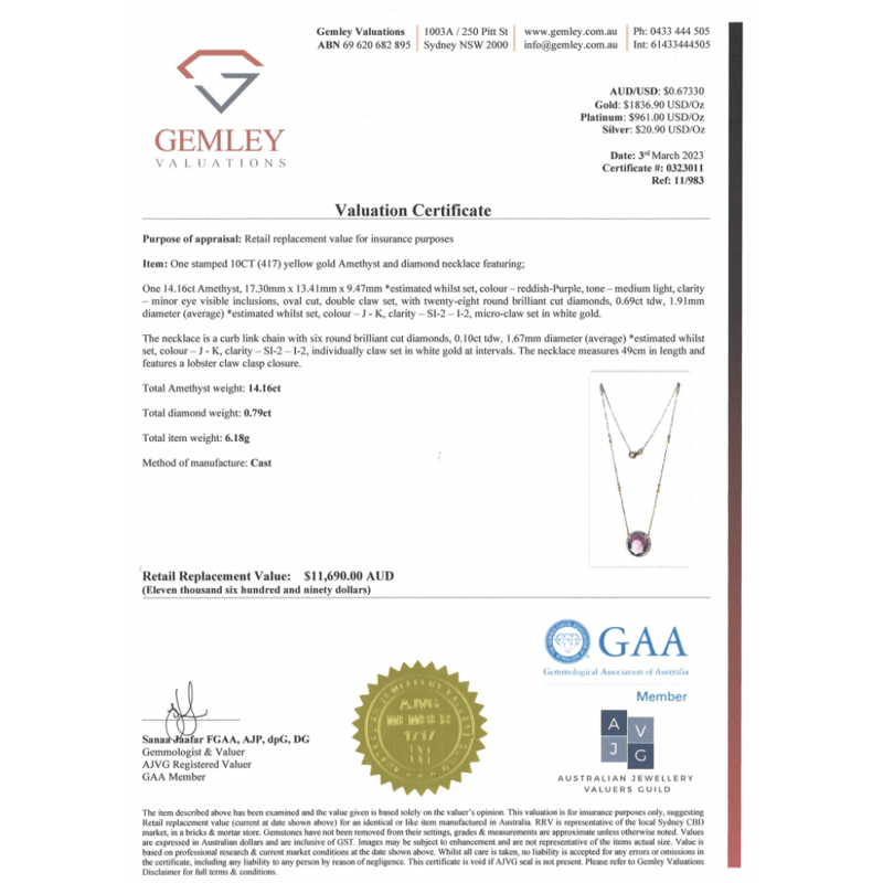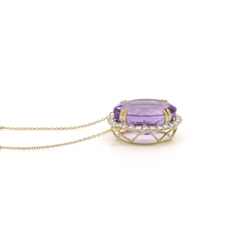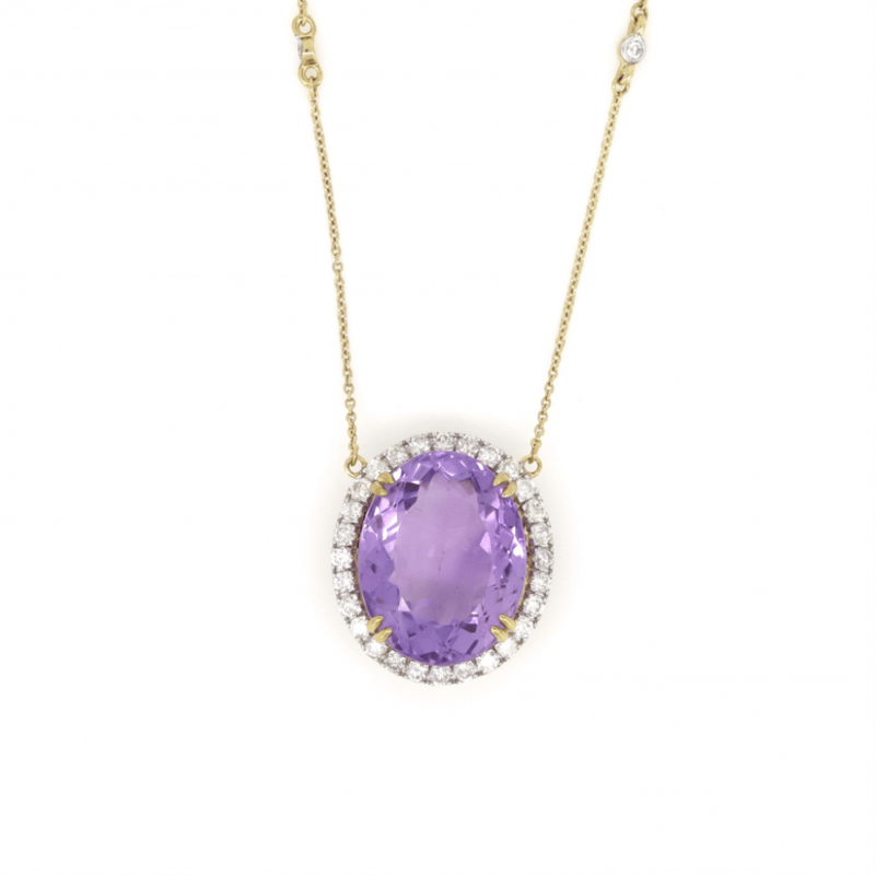 The Pendant Features, One Oval Cut, Reddish-Purple, Amethyst (14.16Ct, Minor Eye Visible Inclusions), Double Claw Set. Surrounding The Stone In A Halo And Decorating The Chain Are, 34 Round Brilliant Cut, Diamonds (0.79Ct Tdw, J-K Colour, Si2-I2 Clarity), Claw Set In White Gold. The Necklace Has A Lobster Claw Clasp. Chain Length Is 49Cm.