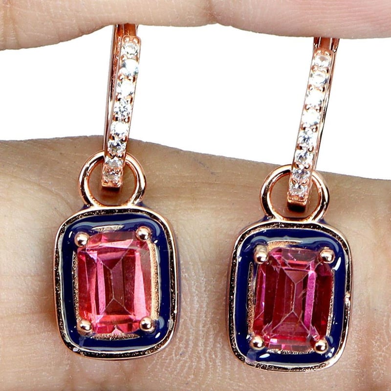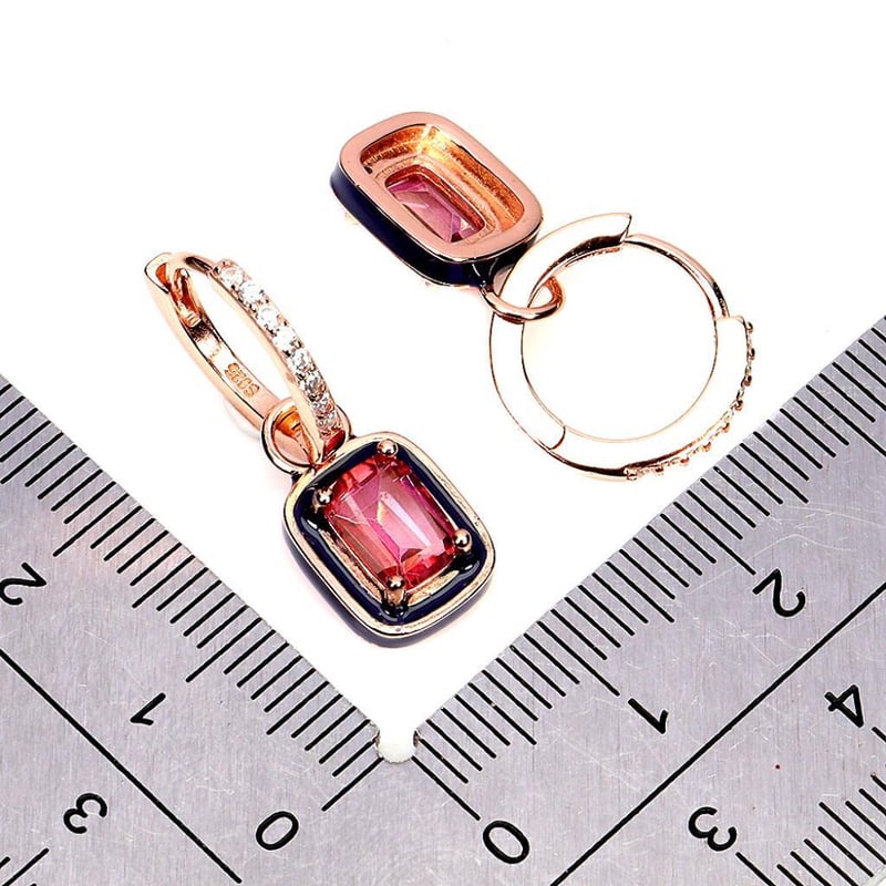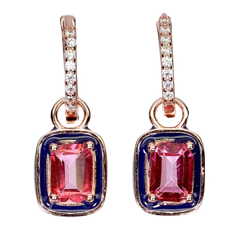 Natural Pink Topaz & Enamel Earrings. Made In Solid Sterling Silver And Plated In14K Rose Gold. Feature Natural Pink Topaz, Coloured Enamel And Sparkling Czs.. Earrings Measure 24.0 X 9.0 Mm.