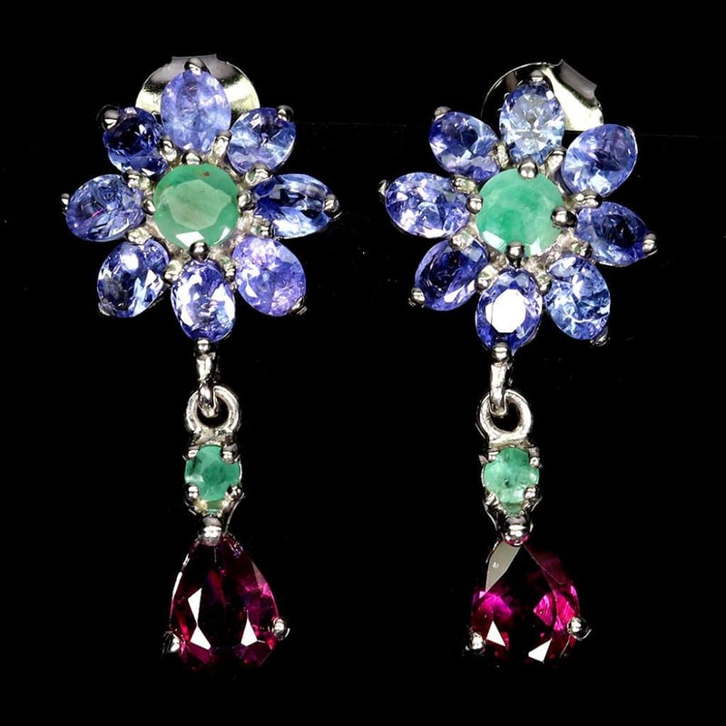 NATURAL TANZANITE EMERALD & GARNET EARRINGS.
