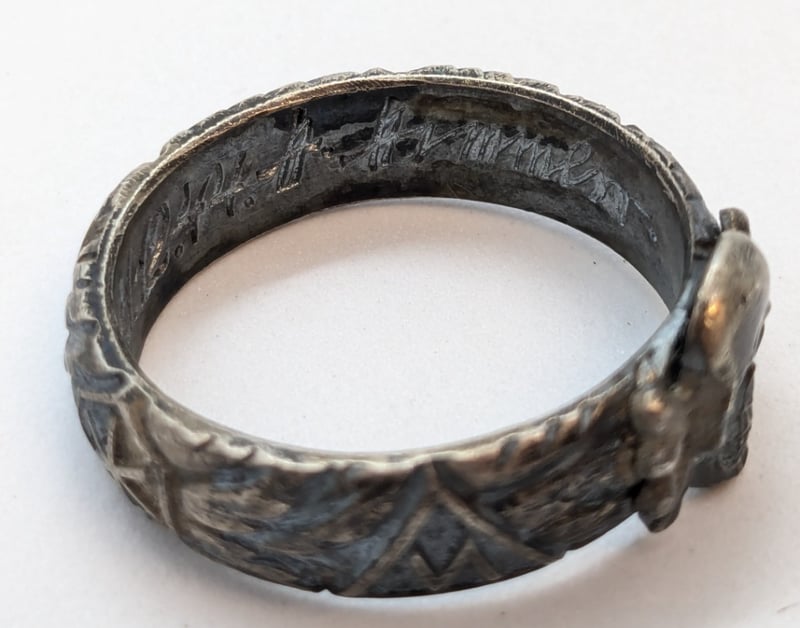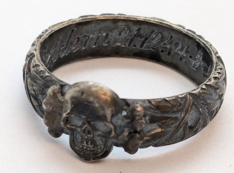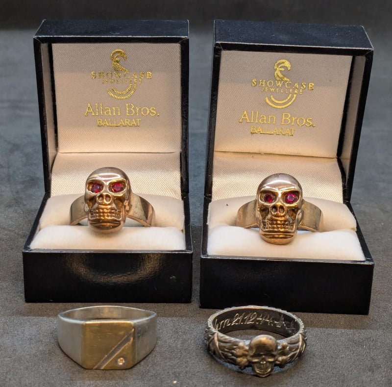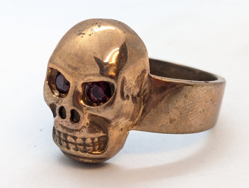 Two Skull Brass Rings With Round Brilliant Cut Red Spinel Gem Eyes, 9ct Silver Ring Stamped '375' and '925', Silver Skull Ring with Engravings