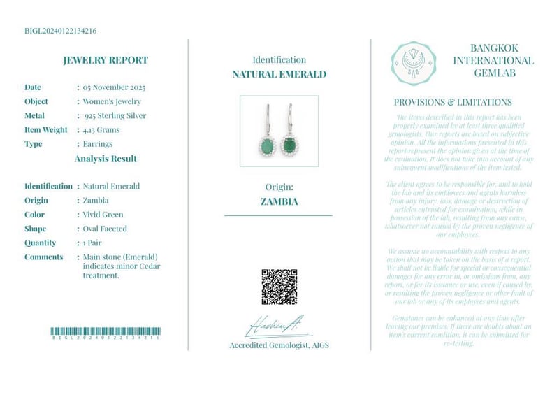 NATURAL ZAMBIAN EMERALD EARRINGS ON 925 SILVER - WITH CERTIFICATE Gemstone : Natural Zambian EmeraldCertificate Number : Bigl20240122134216Item Total Weight : 4.13 GramsGemstone Color : Vivid GreenShape : Oval FacetedMeasurement/Size : N/AComments : Main Stone (Emerald) Indicates Minor Cedar Treatment. ✻ Verify Report Online At Www.Bangkokinternationalgemlab.Co Condition: Good - Refer Images 01611169+32