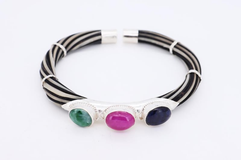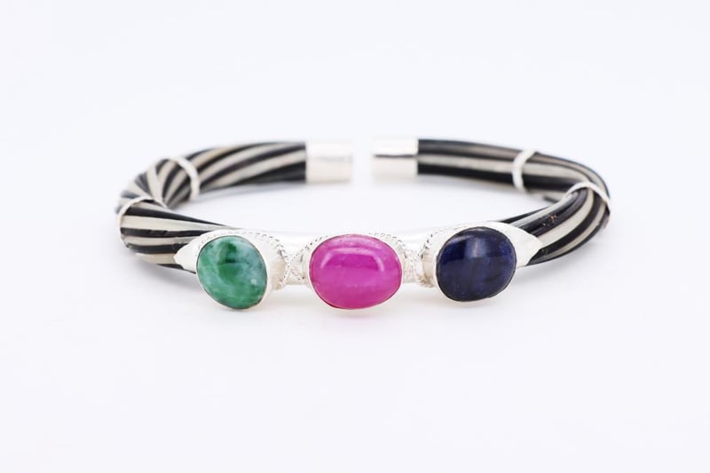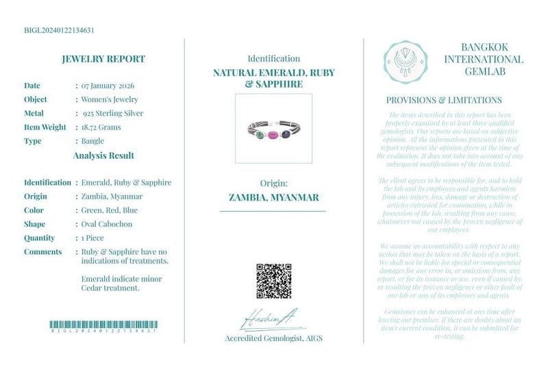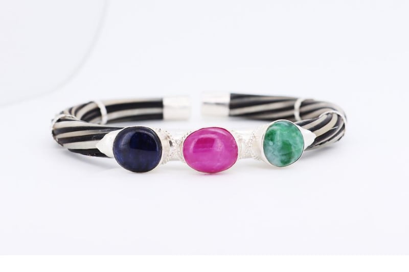 NATURAL EMERALD, RUBY & SAPPHIRE BANGLE ON 925 SILVER - WITH CERTIFICATE