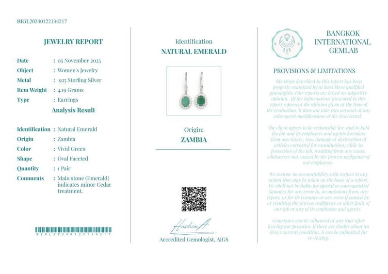 Comments : Main Stone (Emerald) Indicates Minor Cedar Treatment.