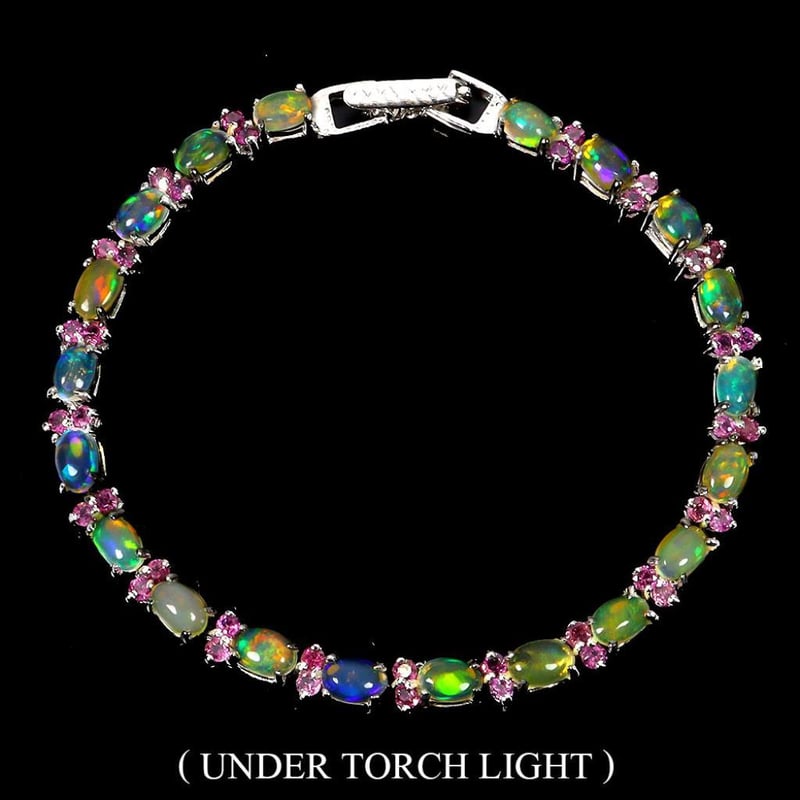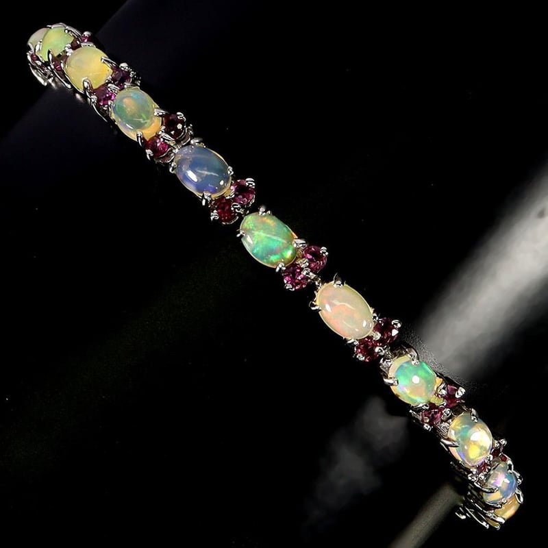 NATURAL RAINBOW FIRE OPAL & RHODOLITE GARNET TENNIS BRACELET.