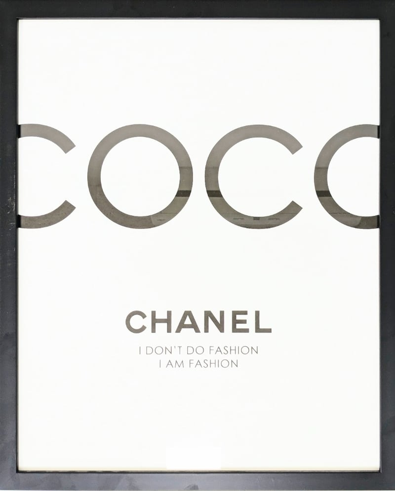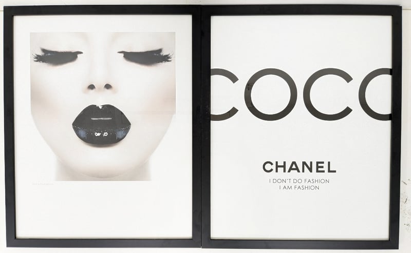 FRAMED "COCO FASHION PAIR" WALL ART SET FEATURING MINIMALIST BLACK AND WHITE DESIGNS INSPIRED BY THE CHANEL BRAND.